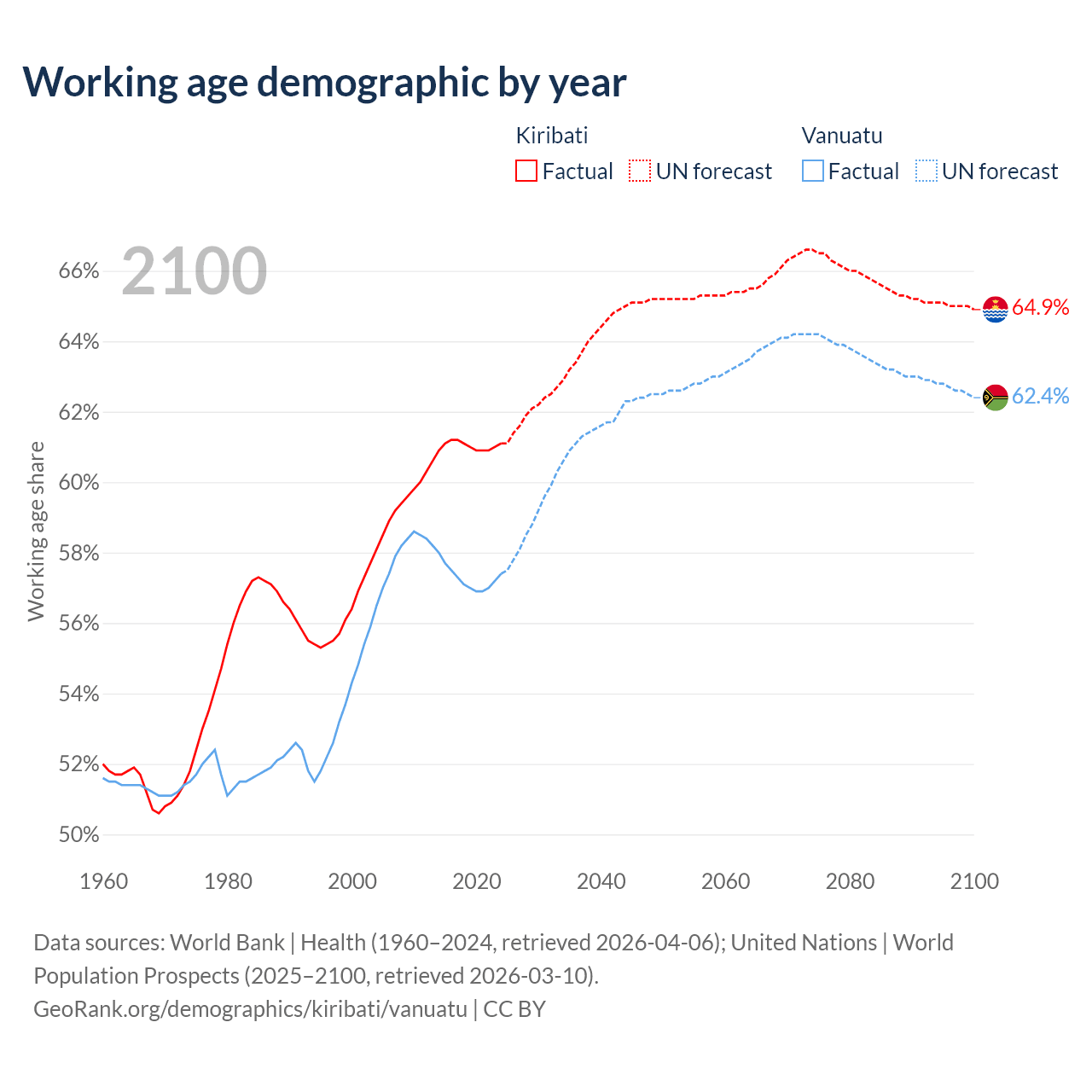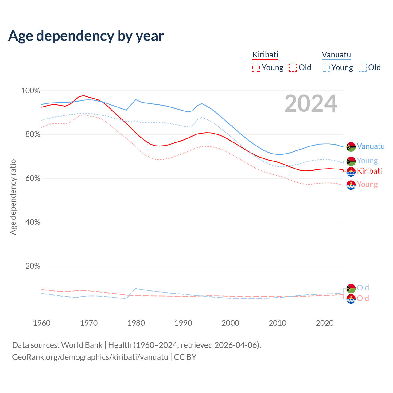 - The share of old-age demographic (65+) in Kiribati is 4.24% vs 4.3% in Vanuatu.