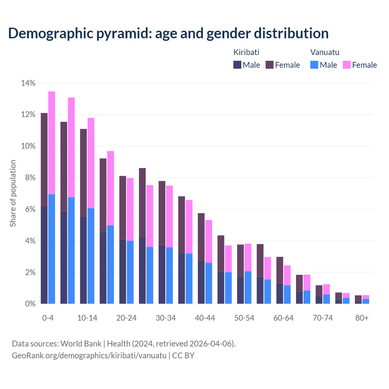 - The share of young demographic (0-15 years old) in Kiribati is 34.7% vs 38.3% in Vanuatu.