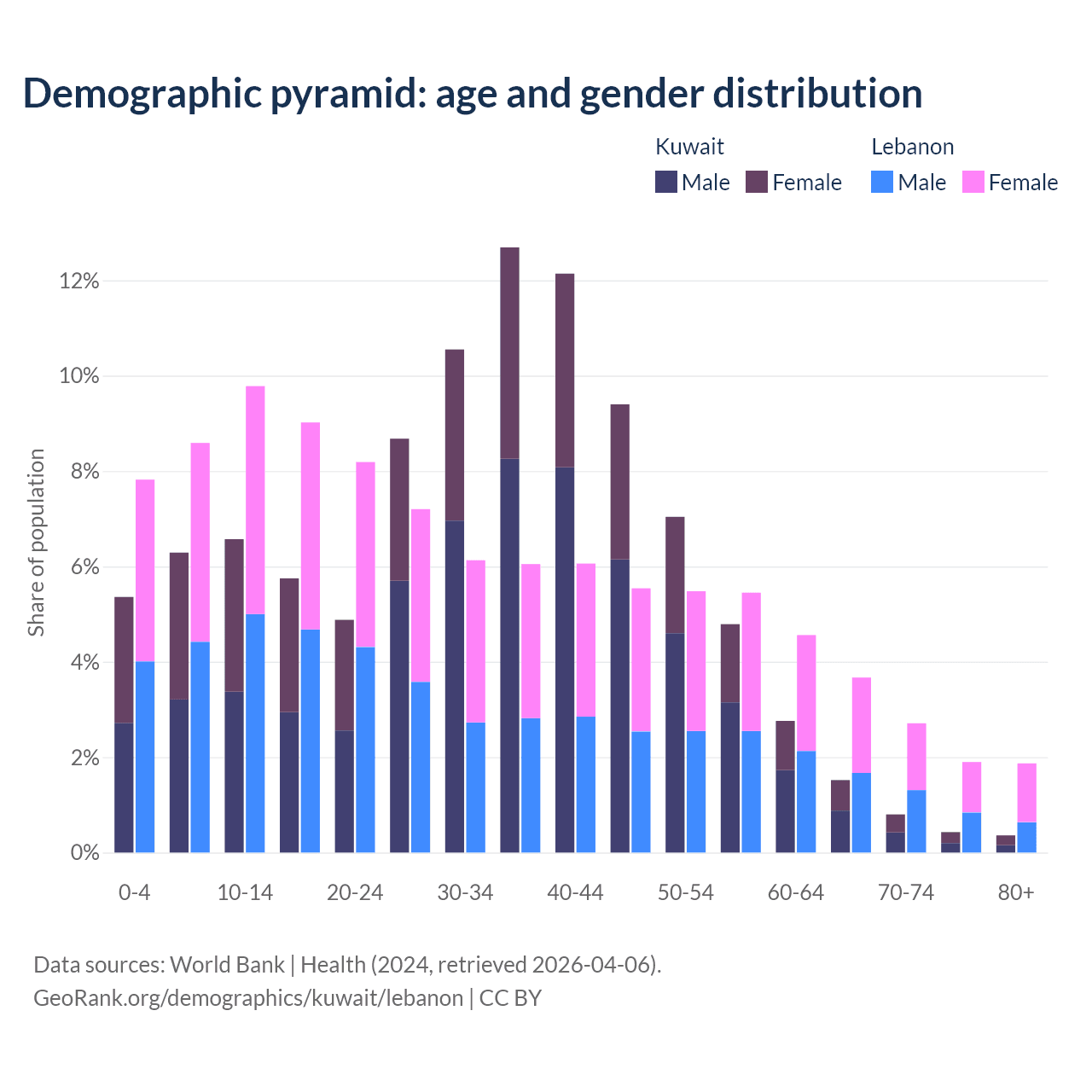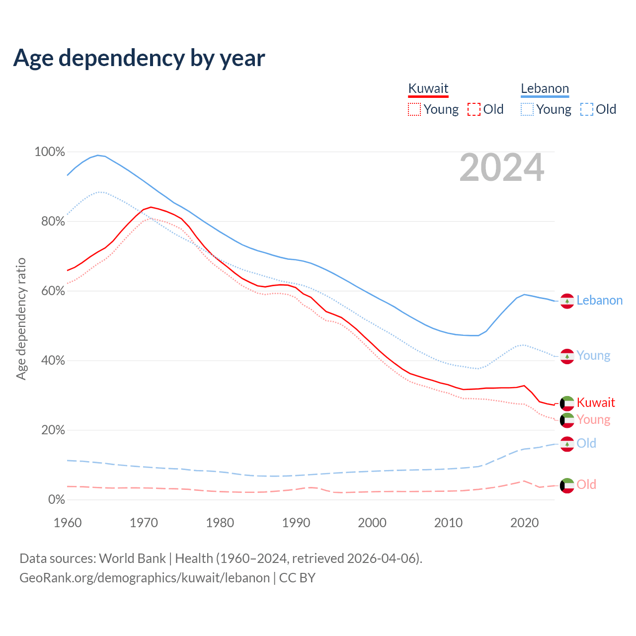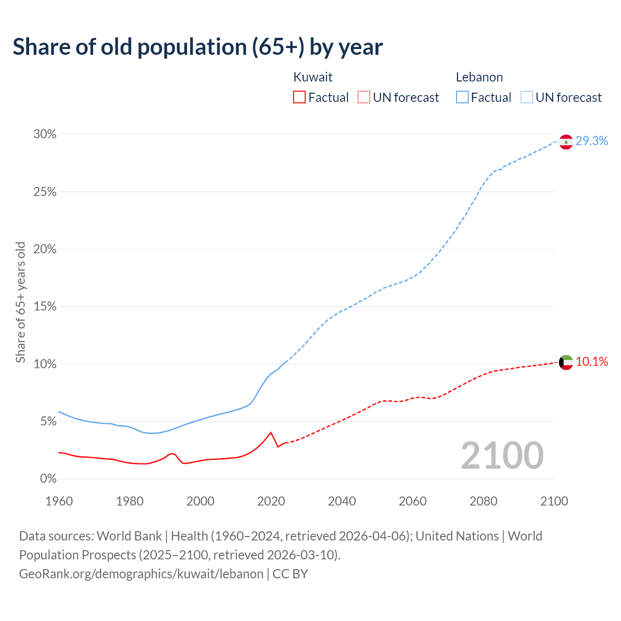 The share of older people aged 65 and over is 3.1% in Kuwait and 10.1% in Lebanon. Life expectancy in Kuwait compared to Lebanon .