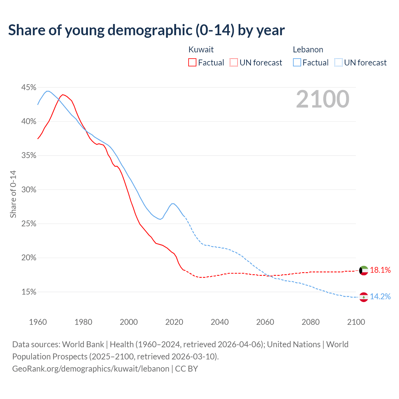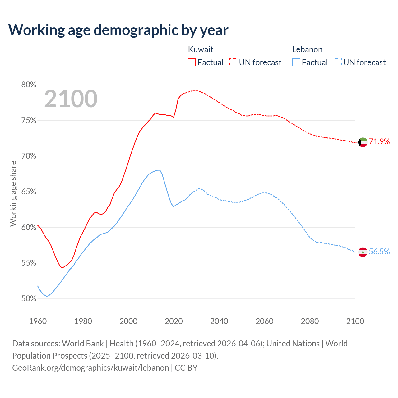 Median age Kuwait vs Lebanon, 1960-2100