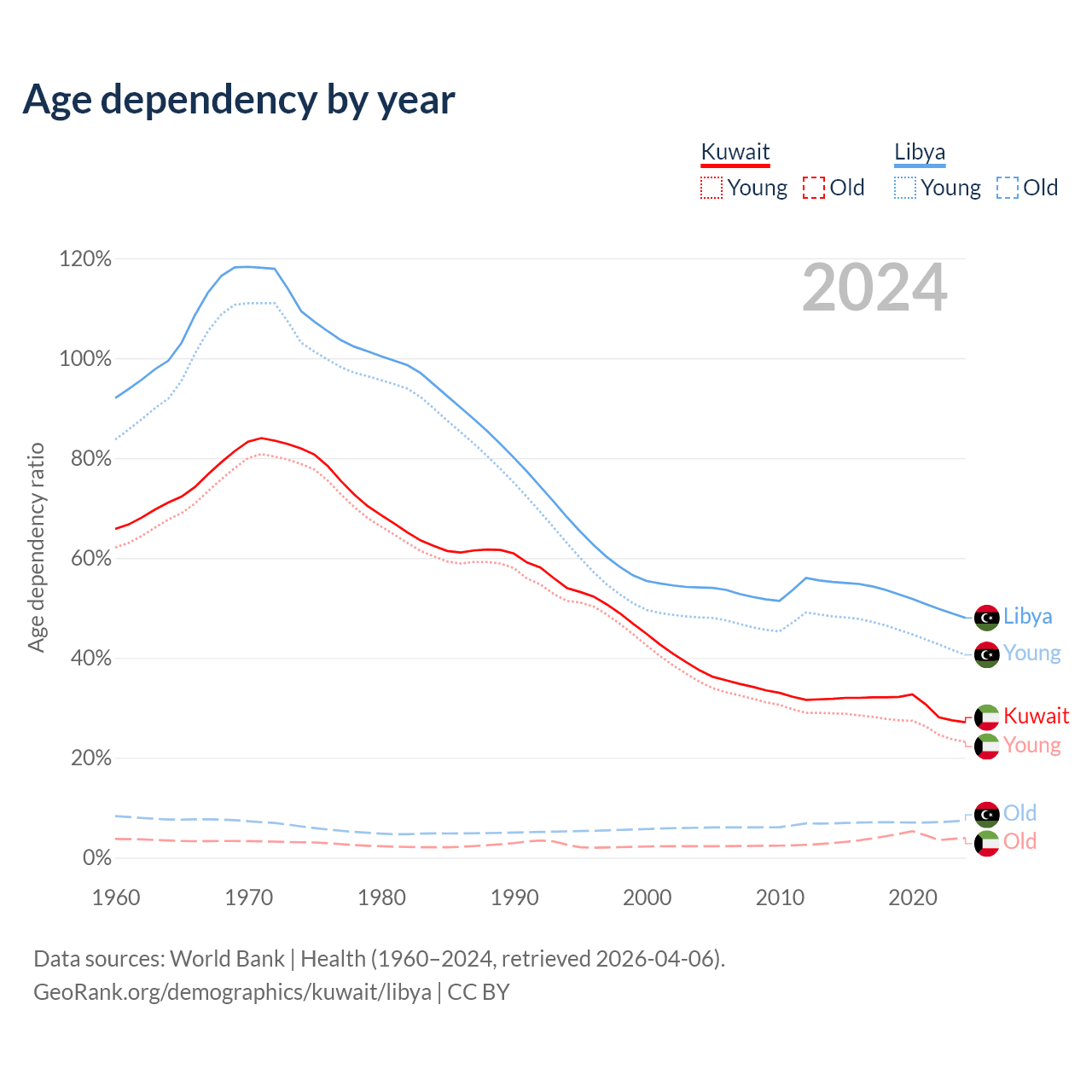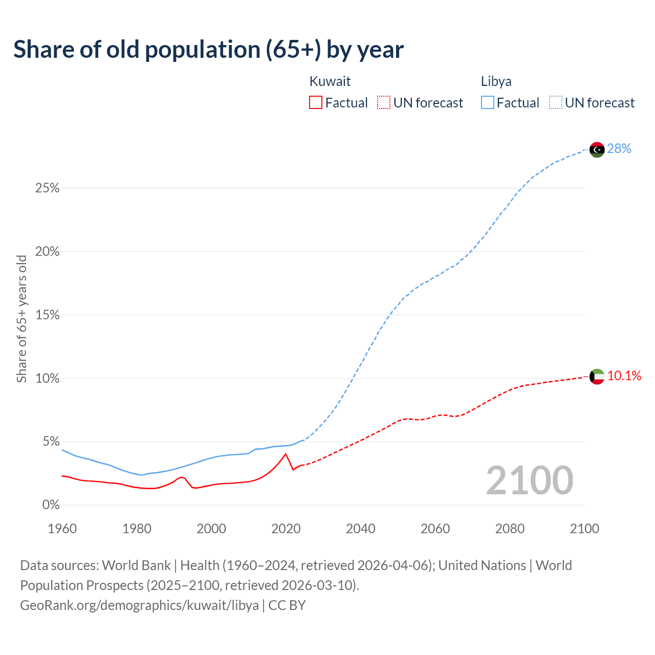 The share of older people aged 65 and over is 3.1% in Kuwait and 5.02% in Libya. Life expectancy in Kuwait compared to Libya .