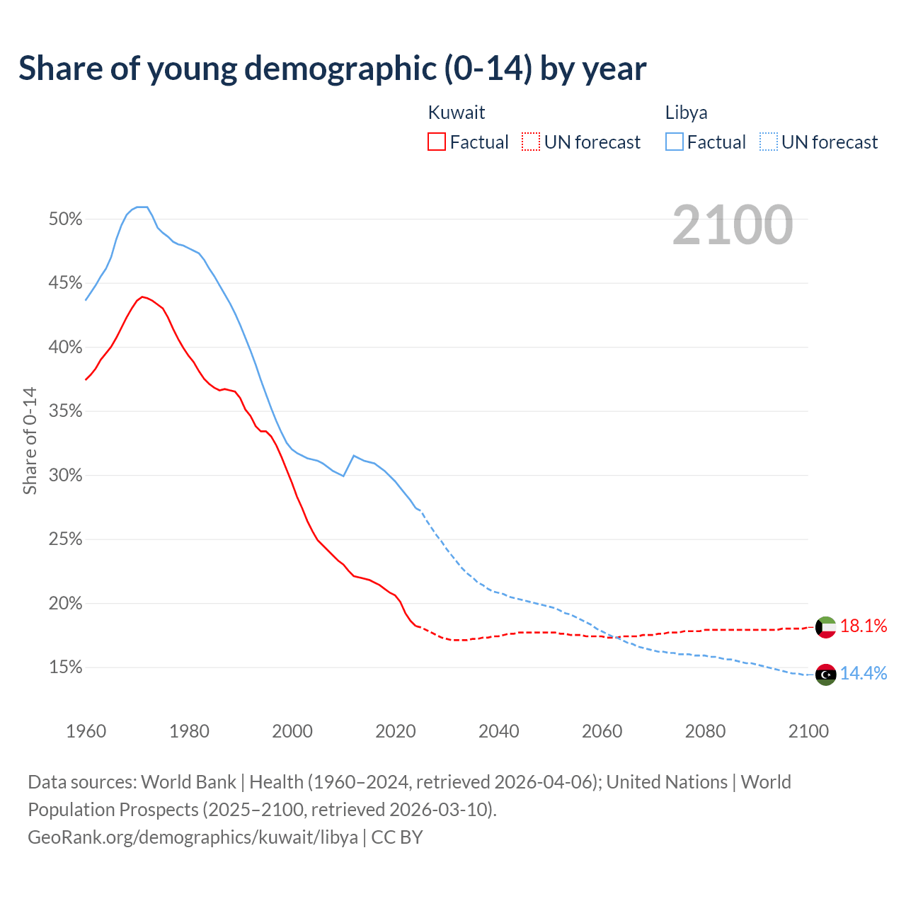 Median age Kuwait vs Libya, 1960-2100