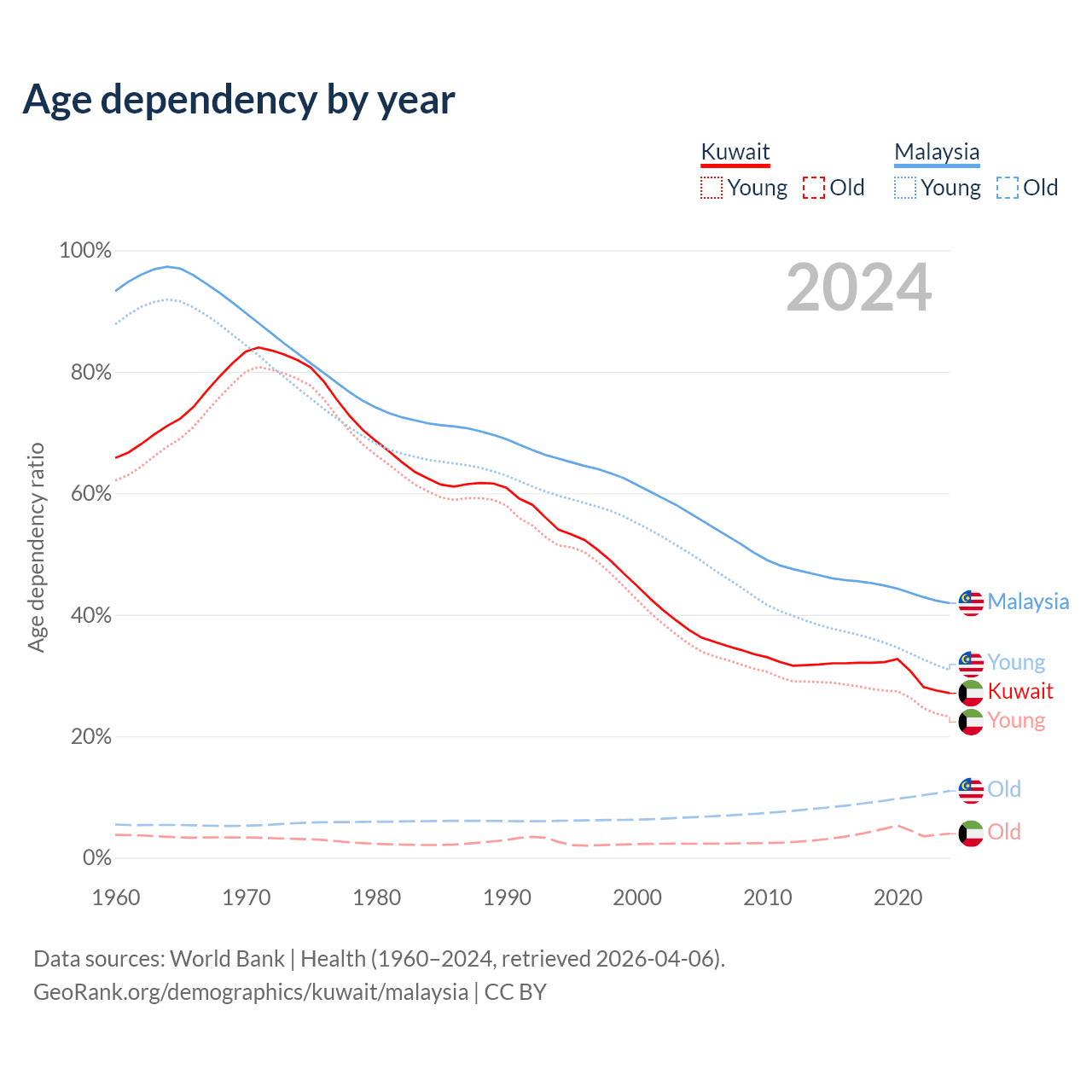 Data sources: World Bank | Health (1960–2024, retrieved 2026-04-06); U.S. Census Bureau (1960–2024, retrieved 2026-02-08).