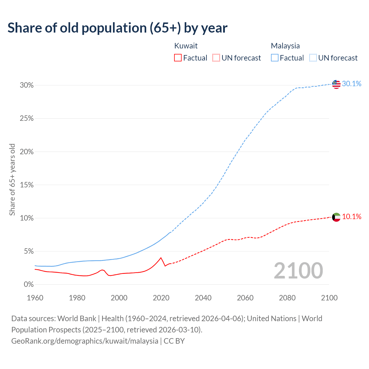 The share of older people aged 65 and over is 3.1% in Kuwait and 7.74% in Malaysia. Life expectancy in Kuwait compared to Malaysia .