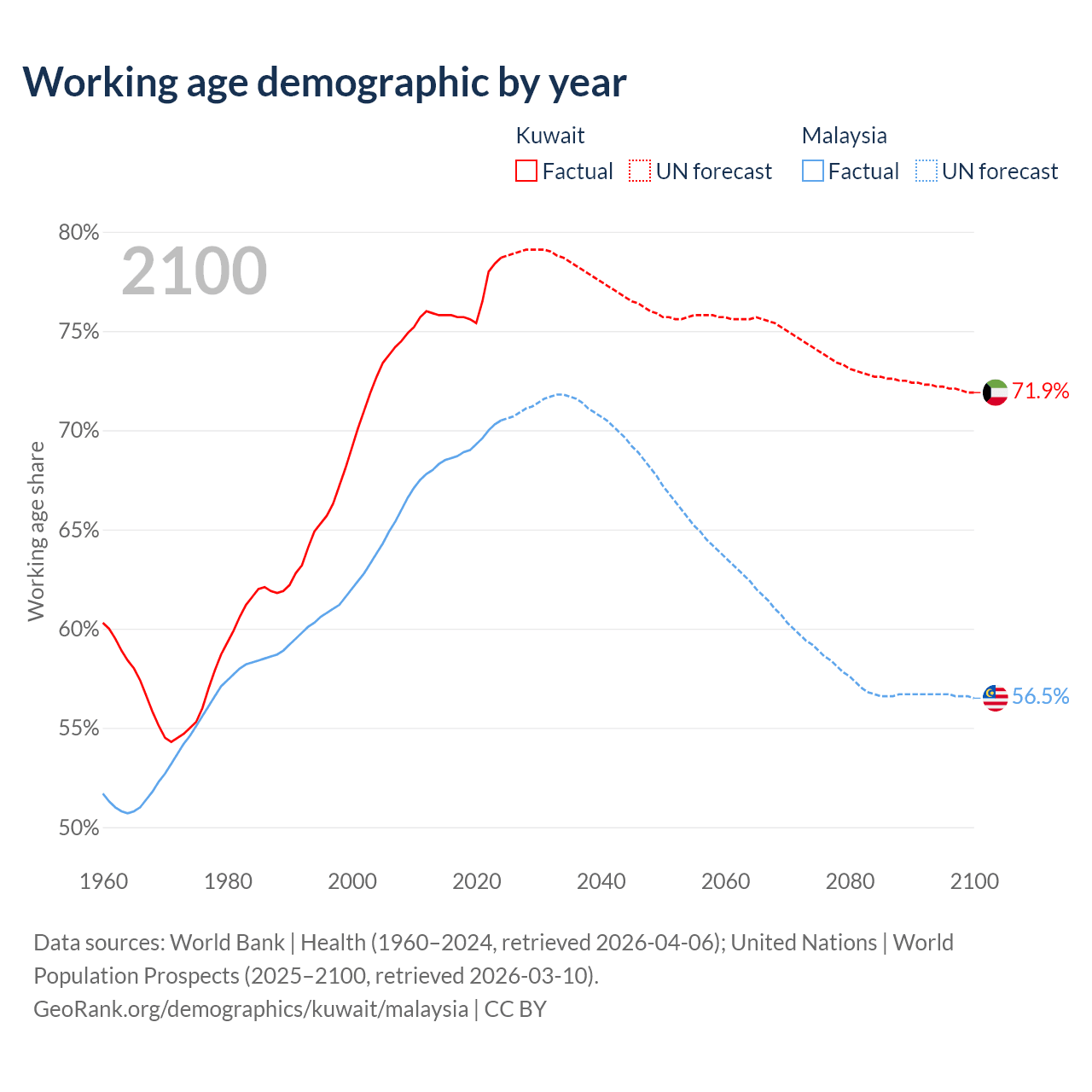 Median age Kuwait vs Malaysia, 1960-2100