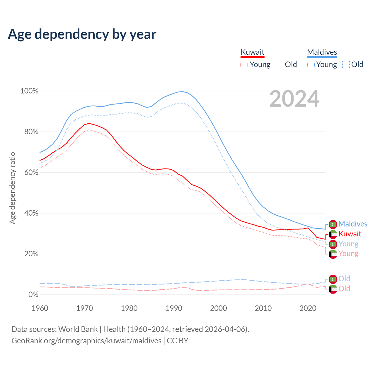 Data sources: World Bank | Health (1960–2024, retrieved 2026-04-06); U.S. Census Bureau (1960–2024, retrieved 2026-02-08).