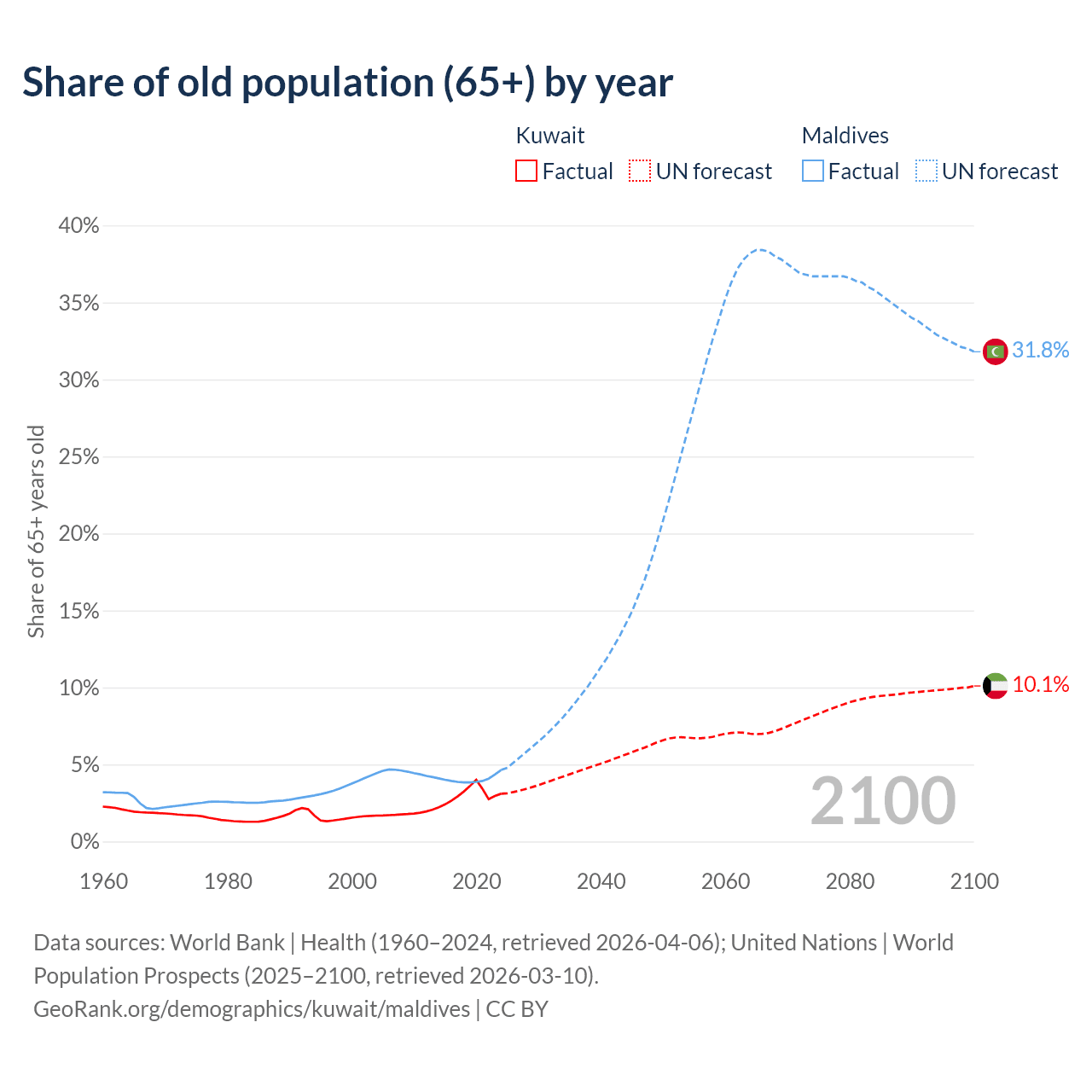 The share of older people aged 65 and over is 3.1% in Kuwait and 4.64% in Maldives. Life expectancy in Kuwait compared to Maldives .