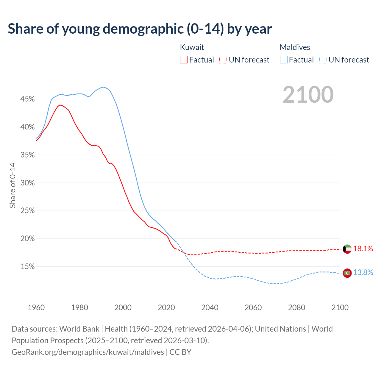 - The share of young demographic (0-15 years old) in Kuwait is 18.2% vs 19.6% in Maldives.
