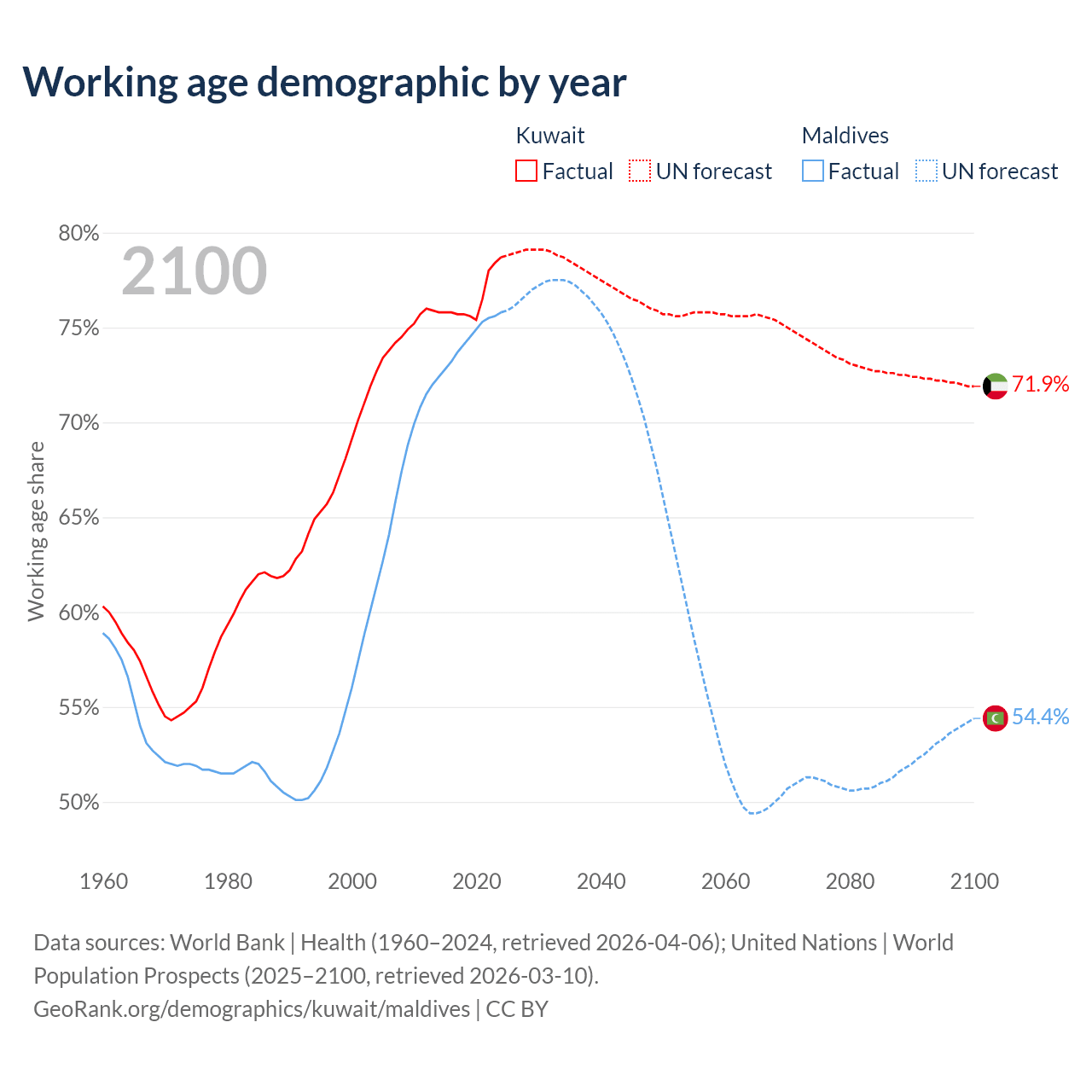 Median age Kuwait vs Maldives, 1960-2100