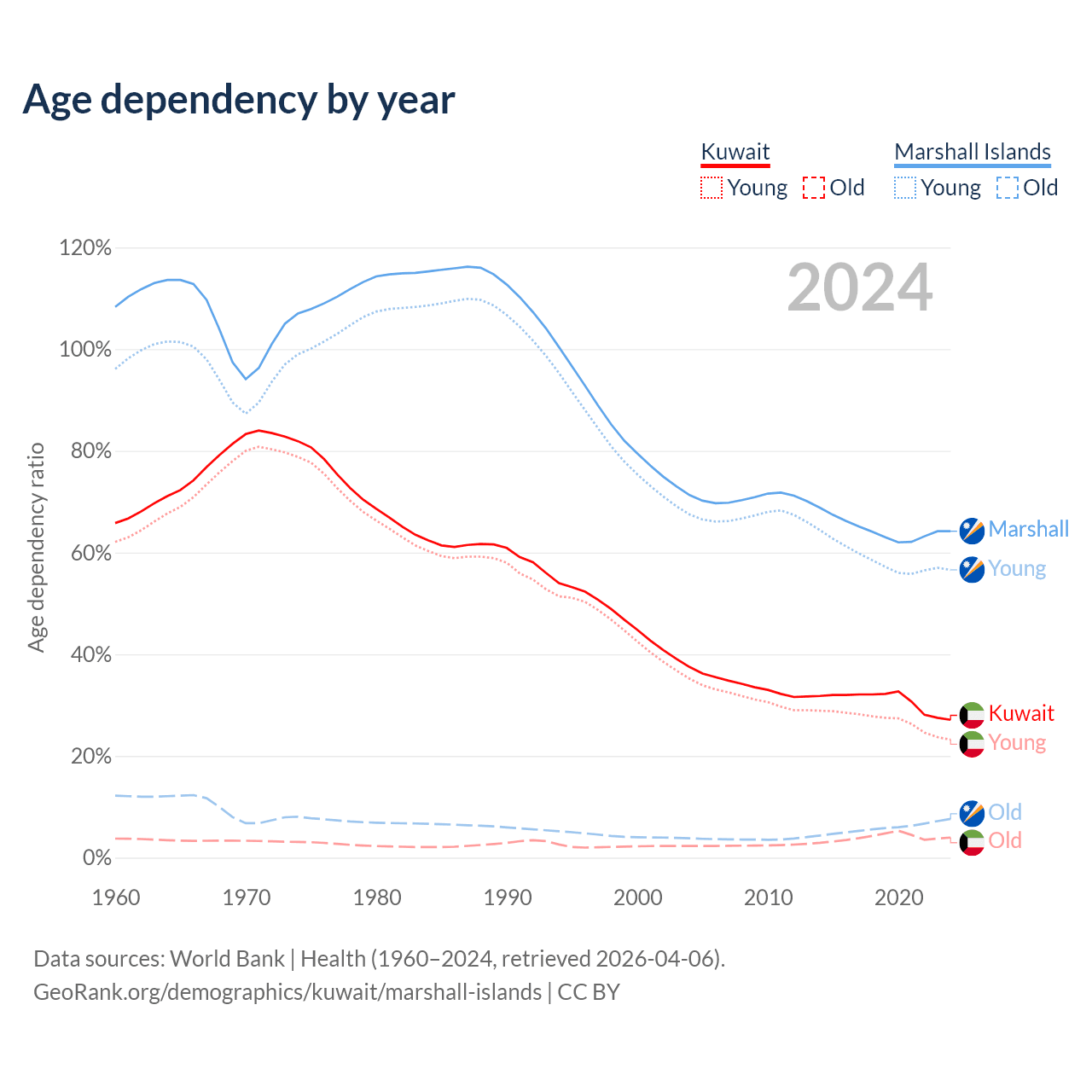 Data sources: World Bank | Health (1960–2024, retrieved 2026-04-06); U.S. Census Bureau (1960–2024, retrieved 2026-02-08).