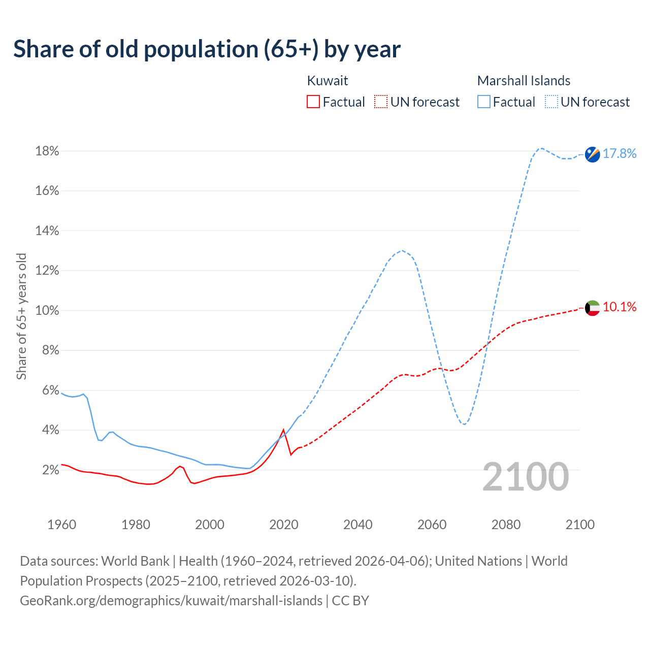 The share of older people aged 65 and over is 3.1% in Kuwait and 4.64% in the Marshall Islands. Life expectancy in Kuwait compared to the Marshall Islands .