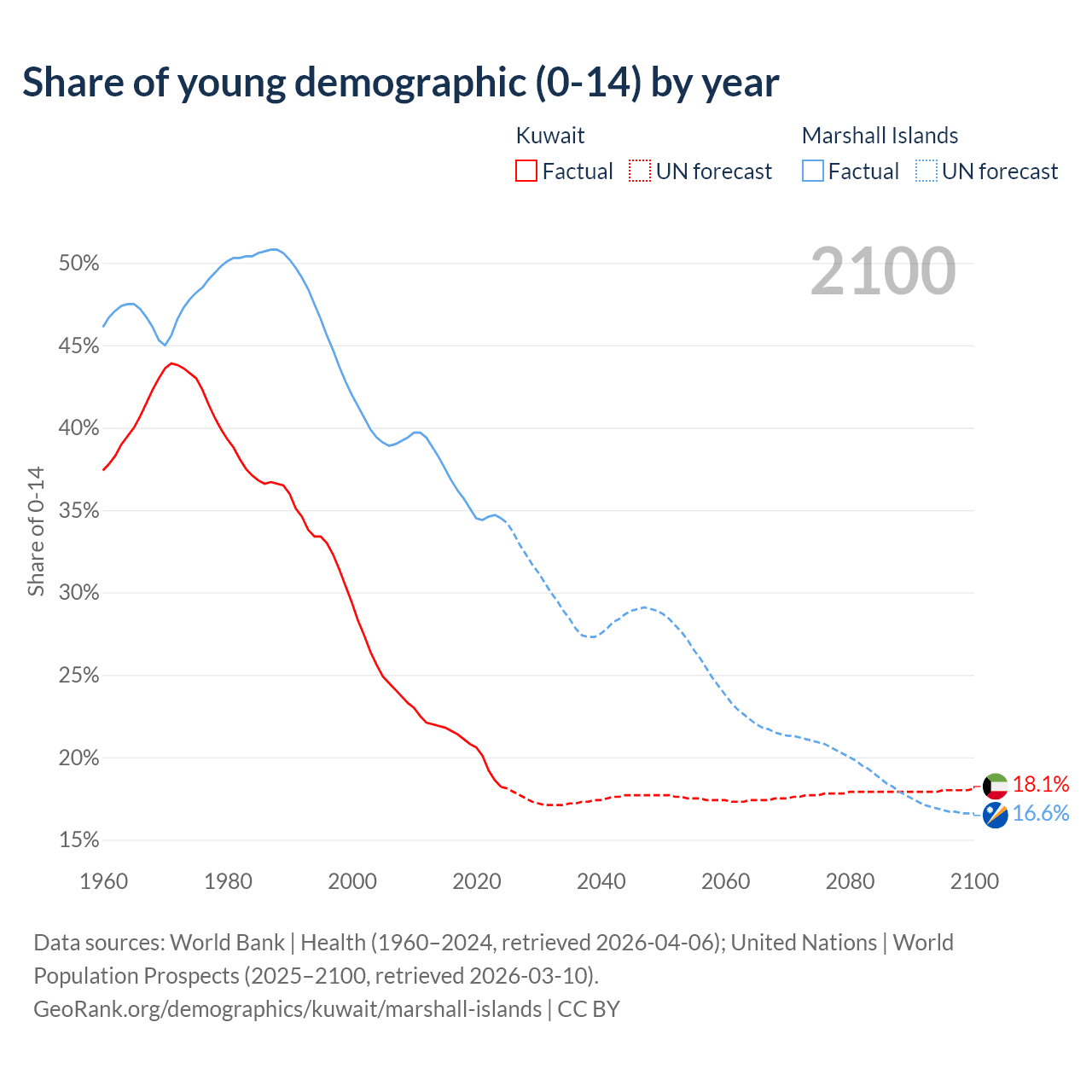 - The share of young demographic (0-15 years old) in Kuwait is 18.2% vs 34.5% in the Marshall Islands.