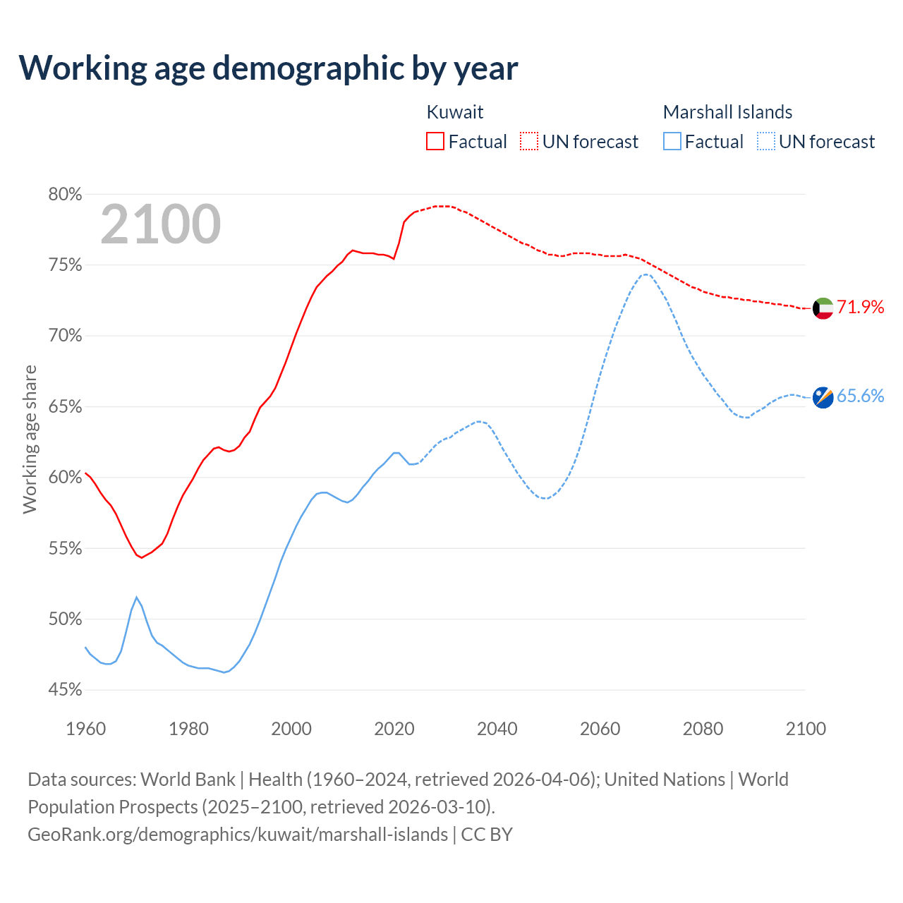- Kuwait has 4.01M working age adults (aged 15-64) vs 21.3K in the Marshall Islands.