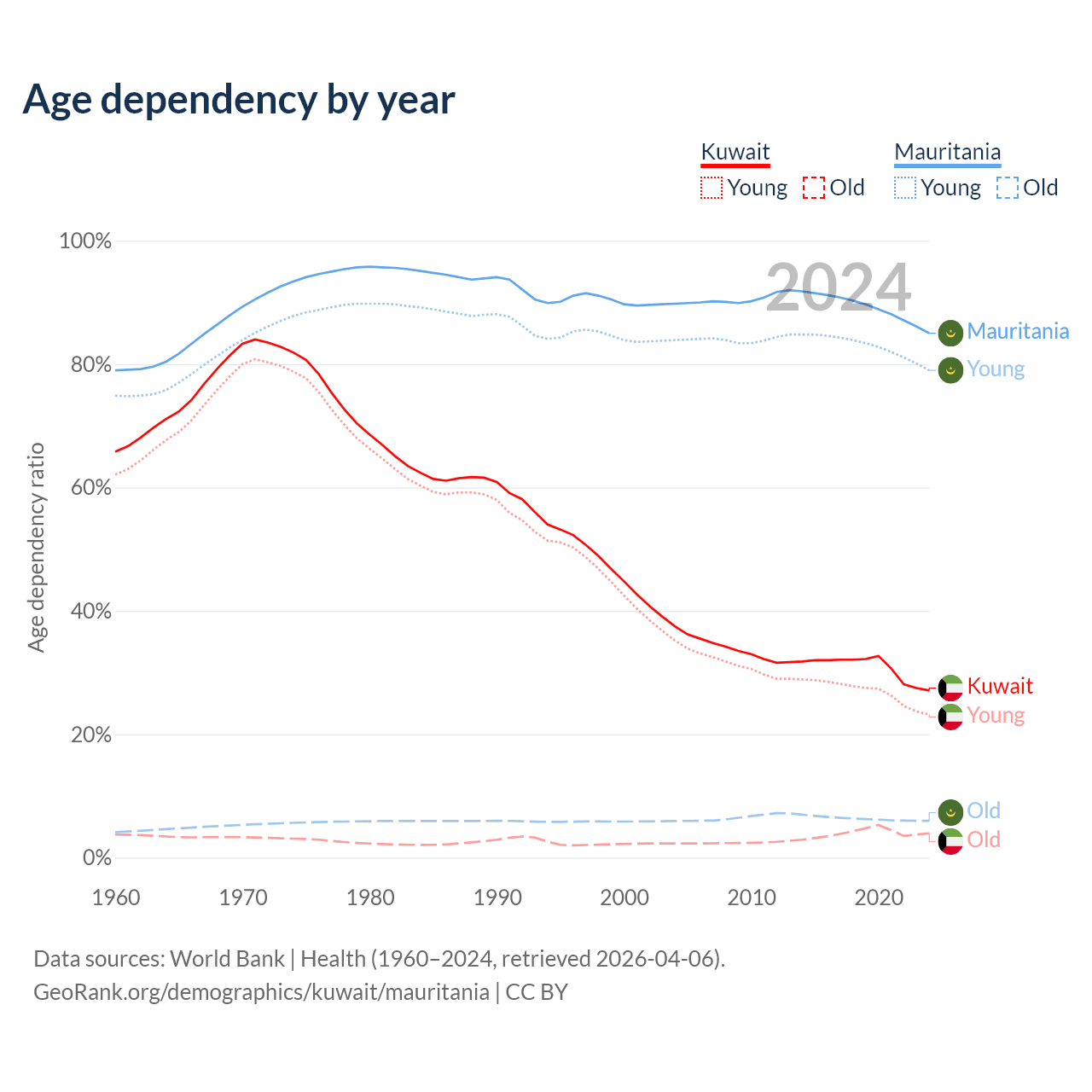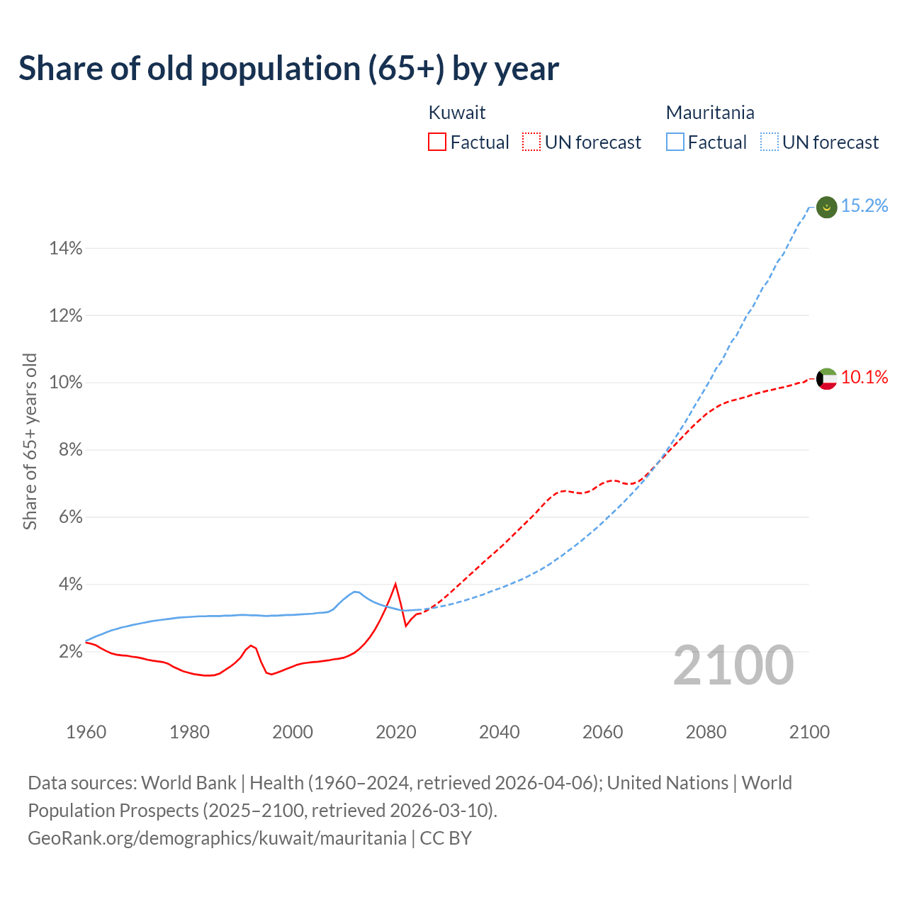 The share of older people aged 65 and over is 3.1% in Kuwait and 3.23% in Mauritania. Life expectancy in Kuwait compared to Mauritania .