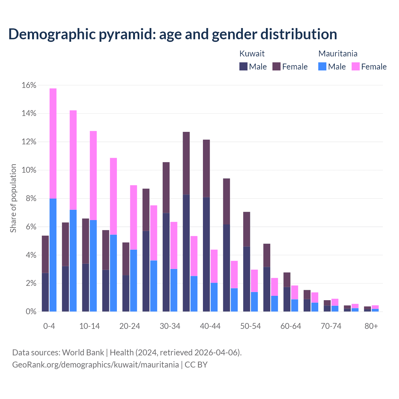 - Kuwait is ranked 71/196 by median age (oldest to youngest) vs 185/196 for Mauritania.