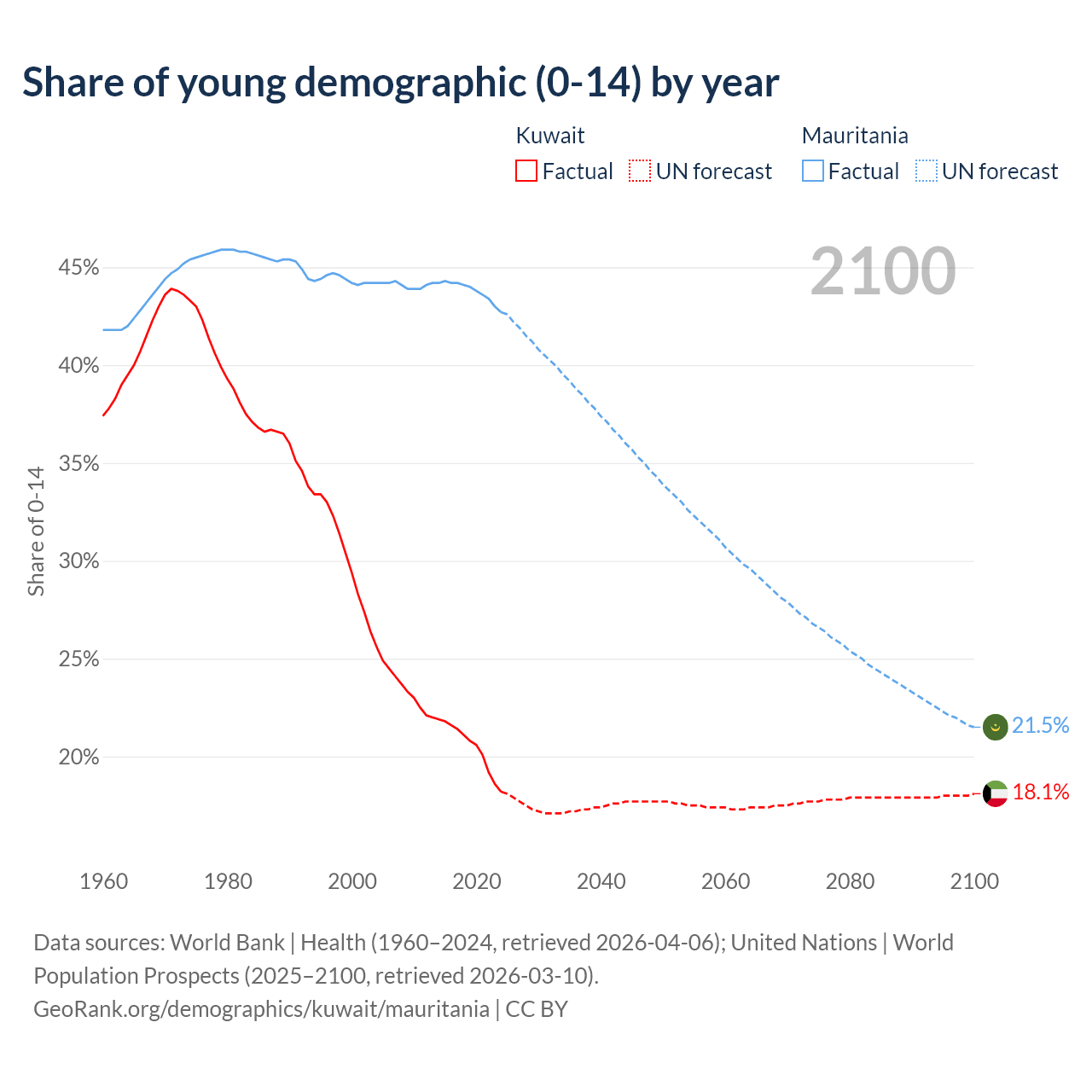 - The share of young demographic (0-15 years old) in Kuwait is 18.2% vs 42.7% in Mauritania.