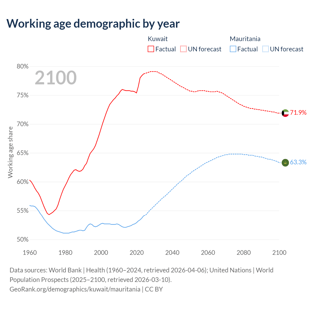 - Kuwait has 4.01M working age adults (aged 15-64) vs 2.98M in Mauritania.