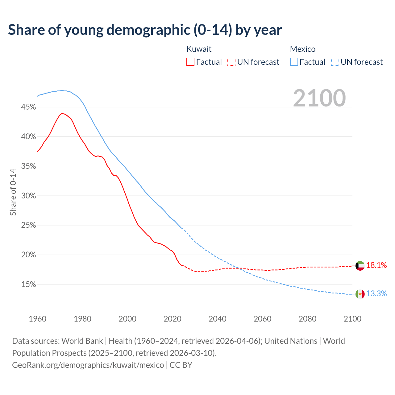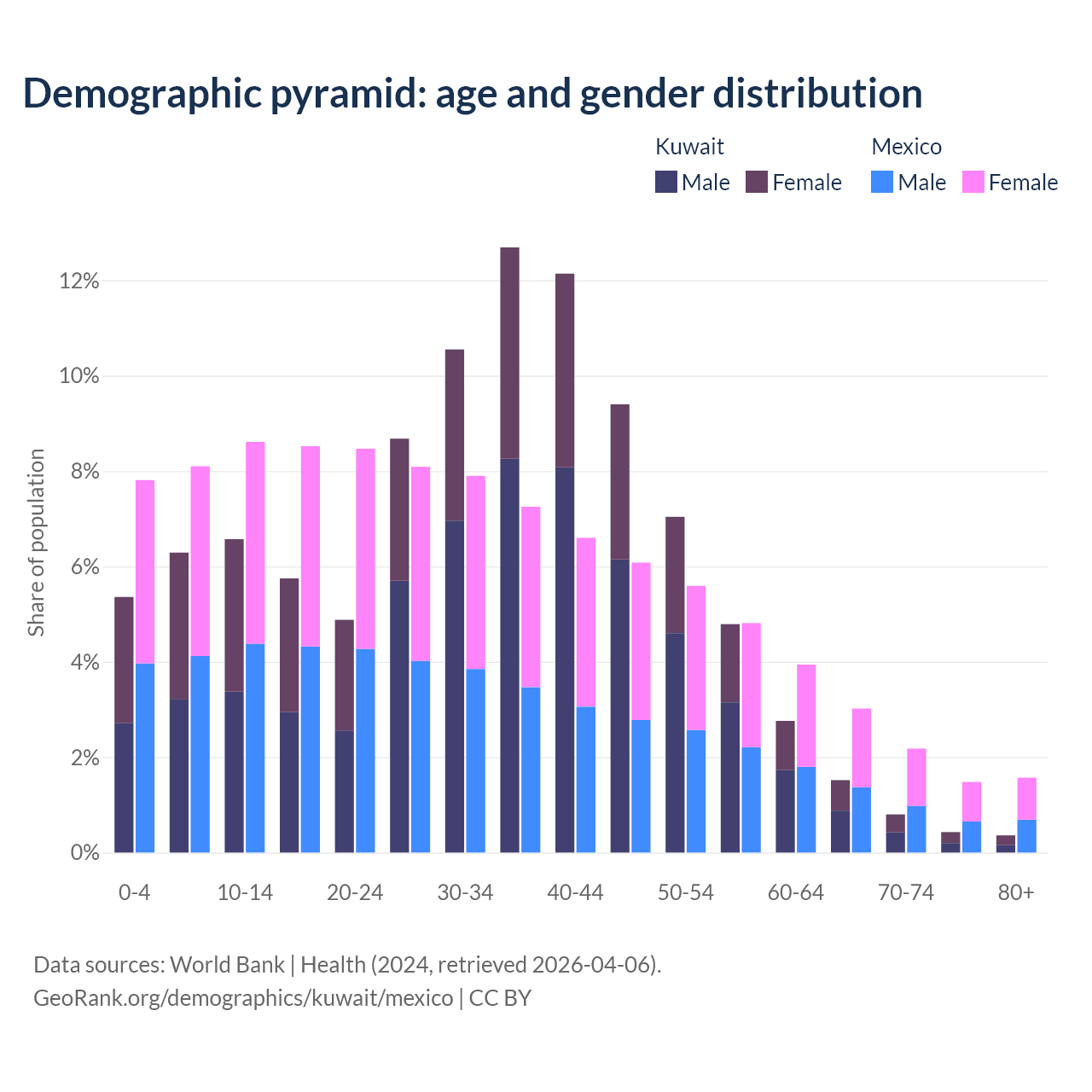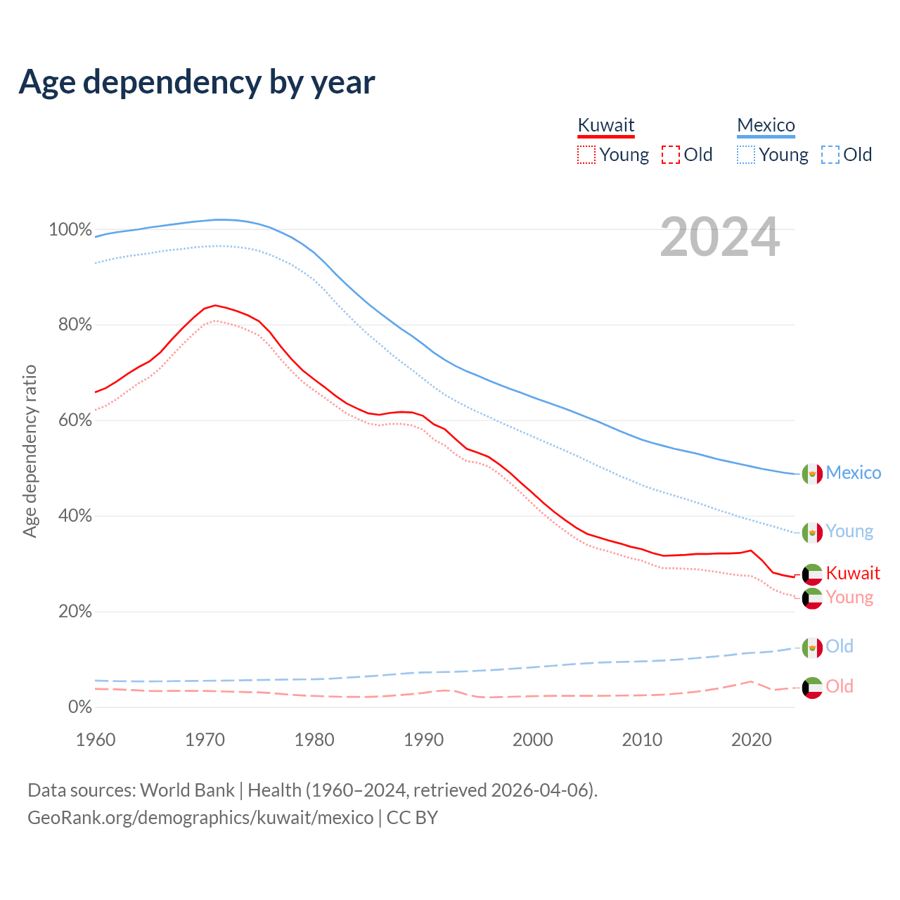 - Kuwait is ranked 71/196 by median age (oldest to youngest) vs 102/196 for Mexico.