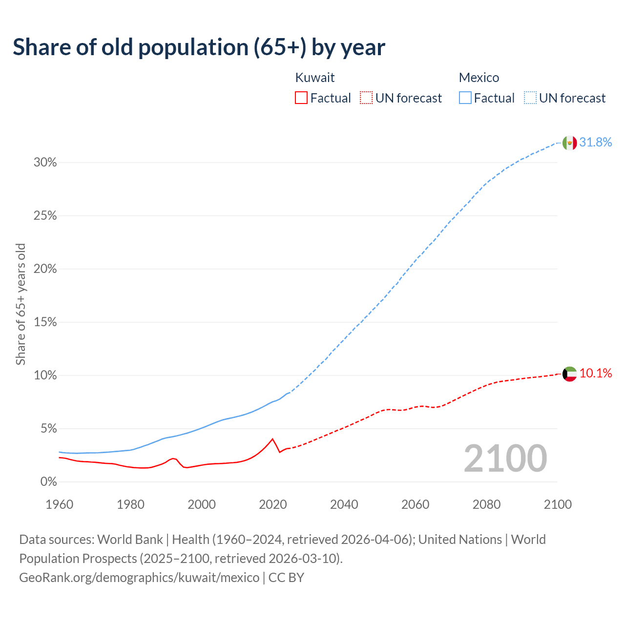 The share of older people aged 65 and over is 3.1% in Kuwait and 8.25% in Mexico. Life expectancy in Kuwait compared to Mexico .