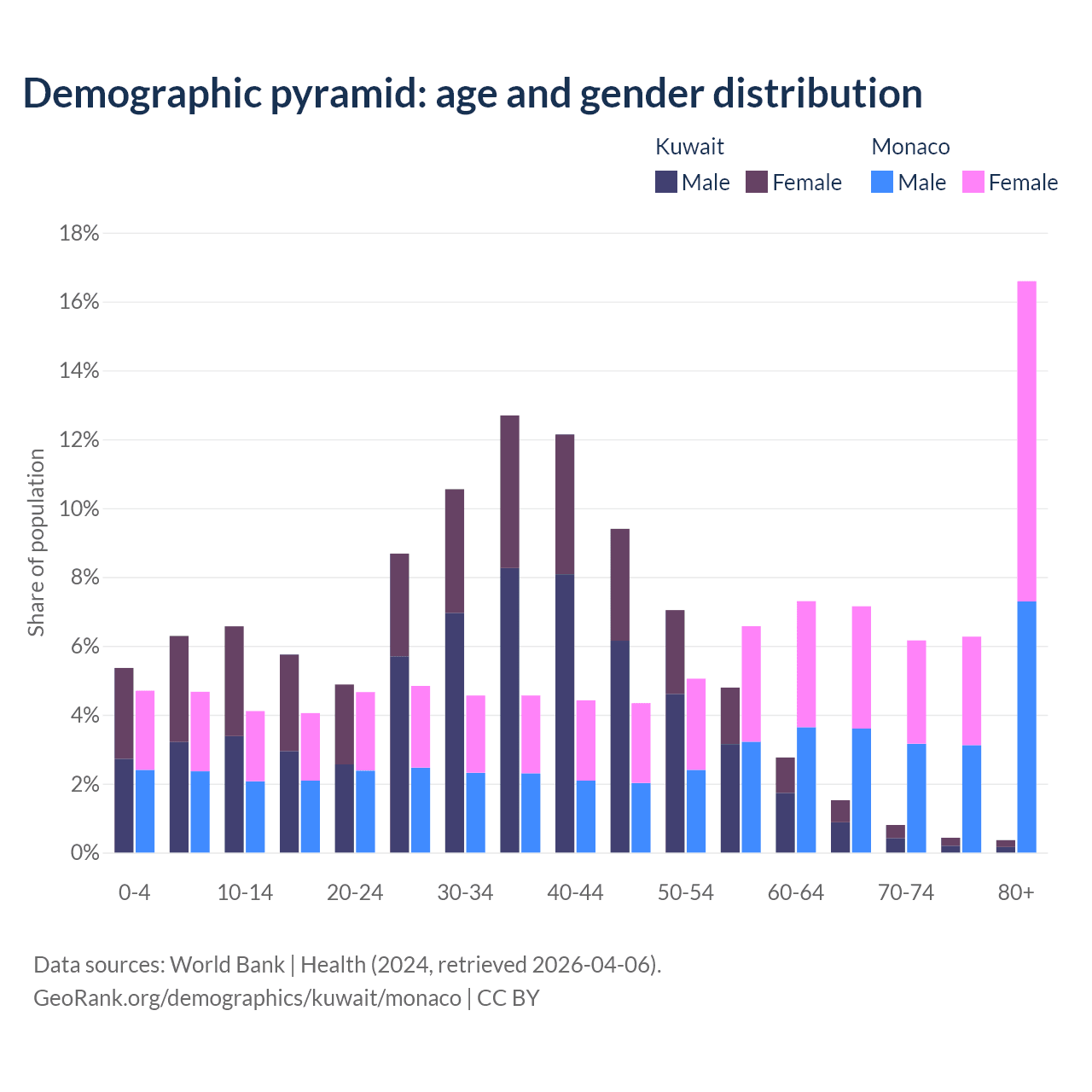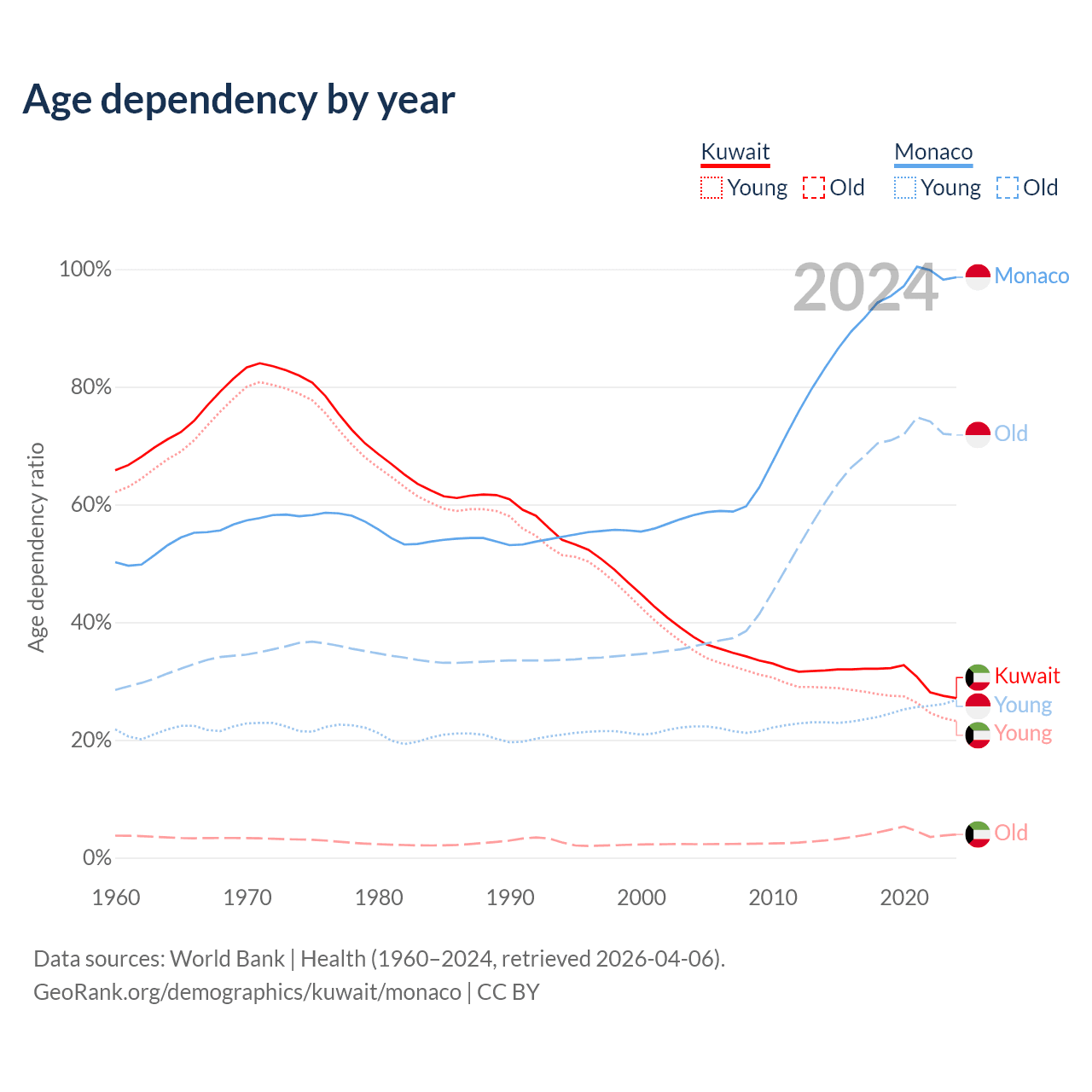 - Kuwait is ranked 71/196 by median age (oldest to youngest) vs 1/196 for Monaco.