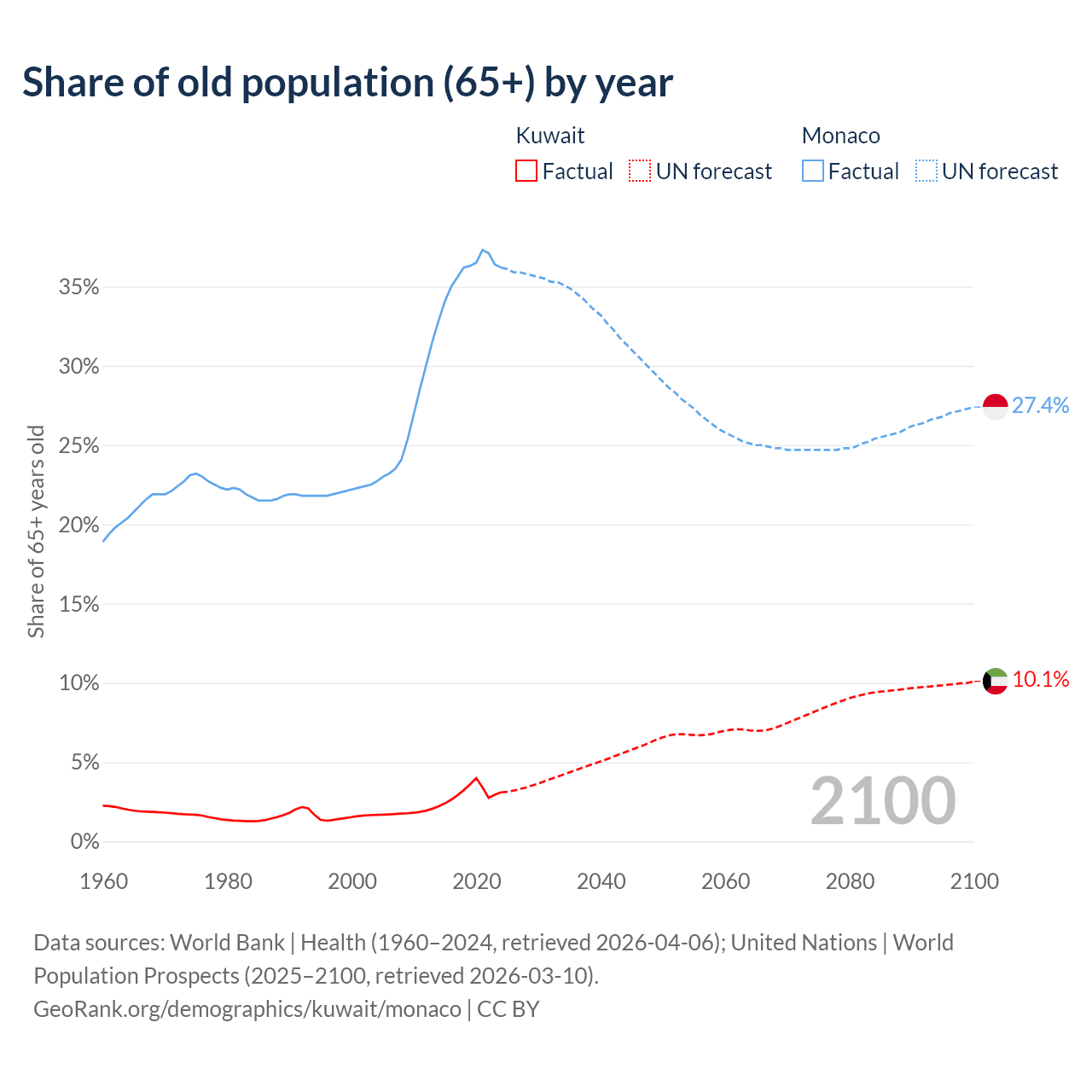 The share of older people aged 65 and over is 3.1% in Kuwait and 36.2% in Monaco. Life expectancy in Kuwait compared to Monaco .