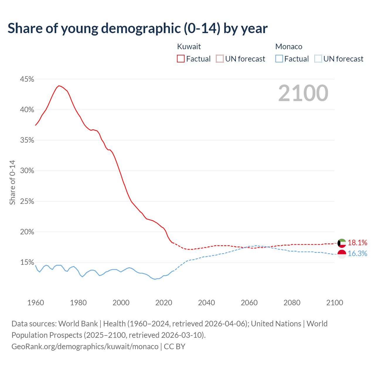 - The share of young demographic (0-15 years old) in Kuwait is 18.2% vs 13.5% in Monaco.