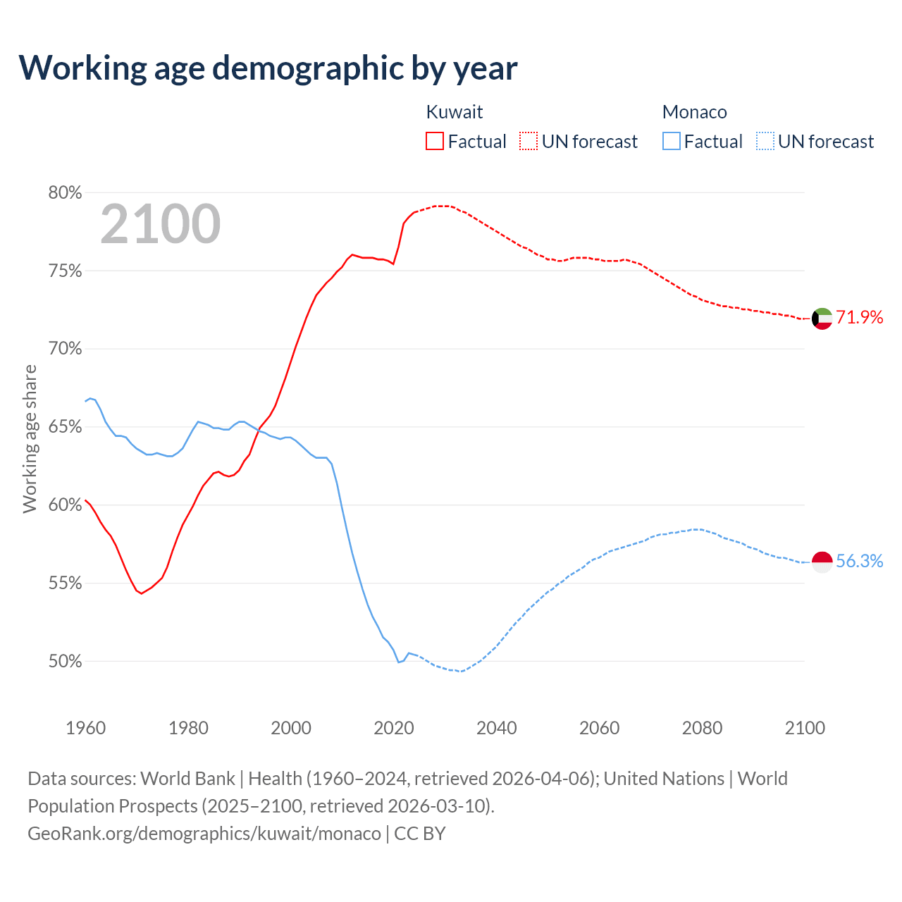 - Kuwait has 4.01M working age adults (aged 15-64) vs 19.2K in Monaco.