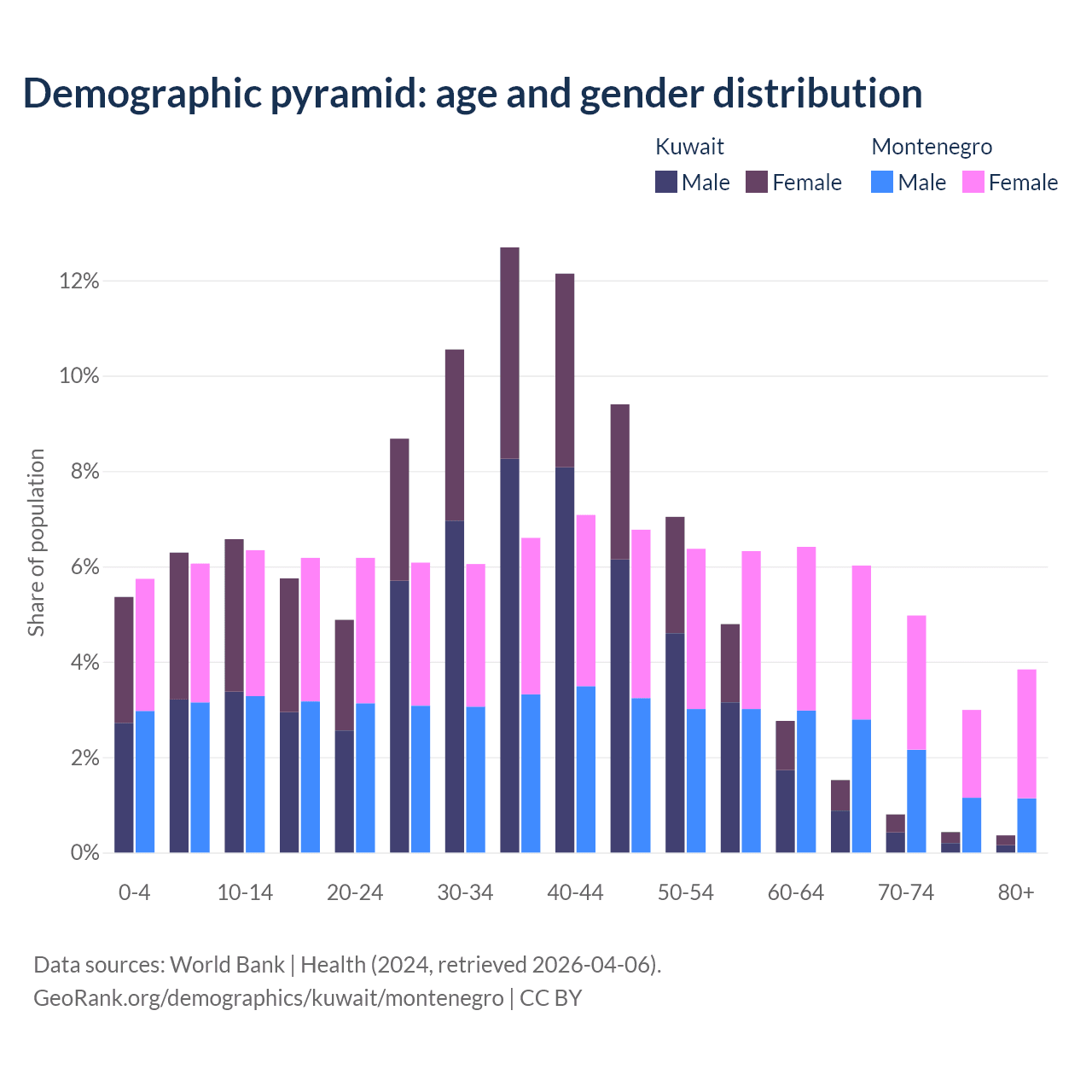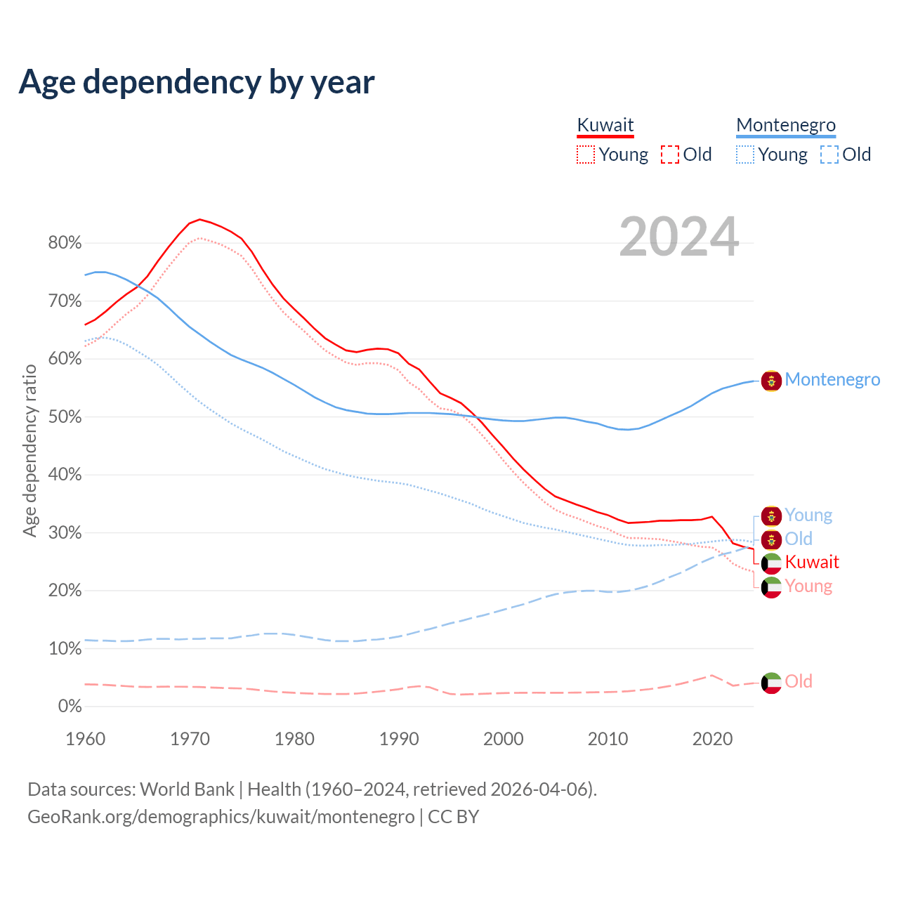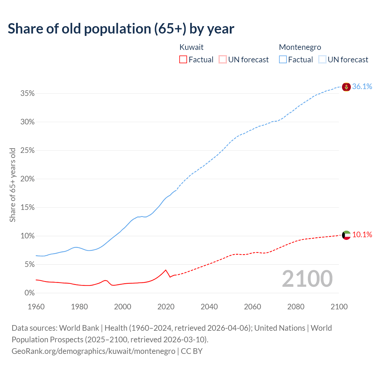 The share of older people aged 65 and over is 3.1% in Kuwait and 17.8% in Montenegro. Life expectancy in Kuwait compared to Montenegro .