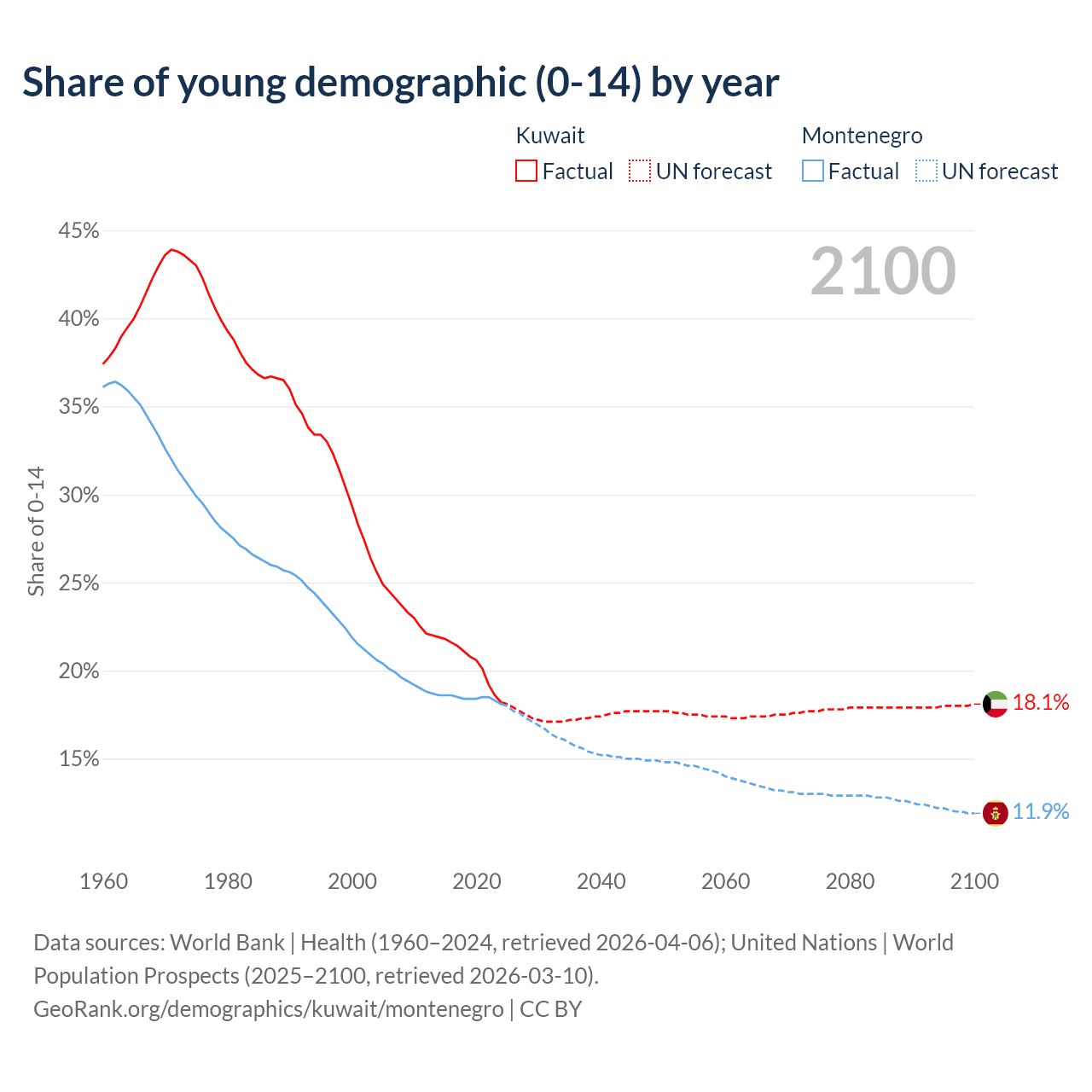 - The share of young demographic (0-15 years old) in Kuwait is 18.2% vs 18.1% in Montenegro.