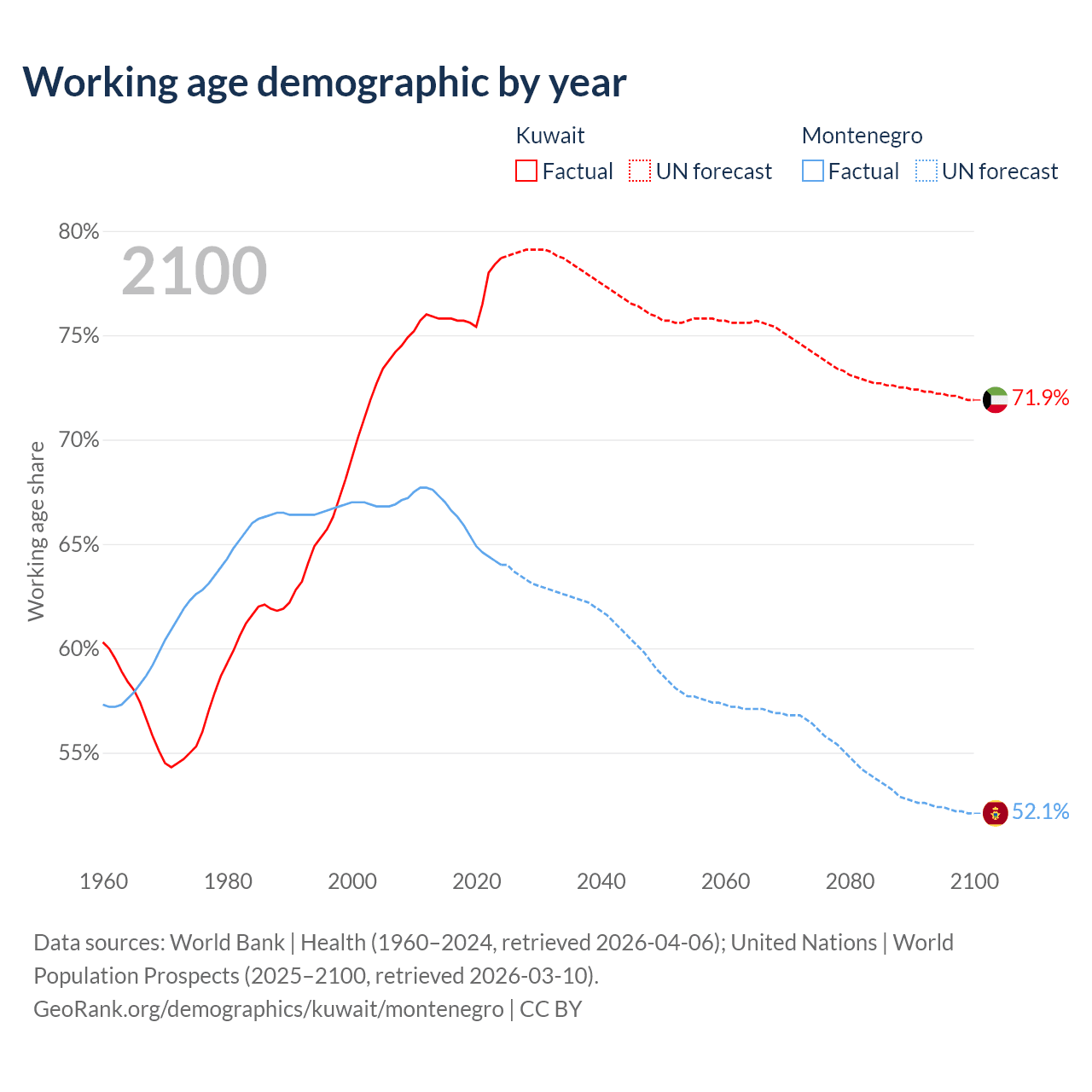 Median age Kuwait vs Montenegro, 1960-2100