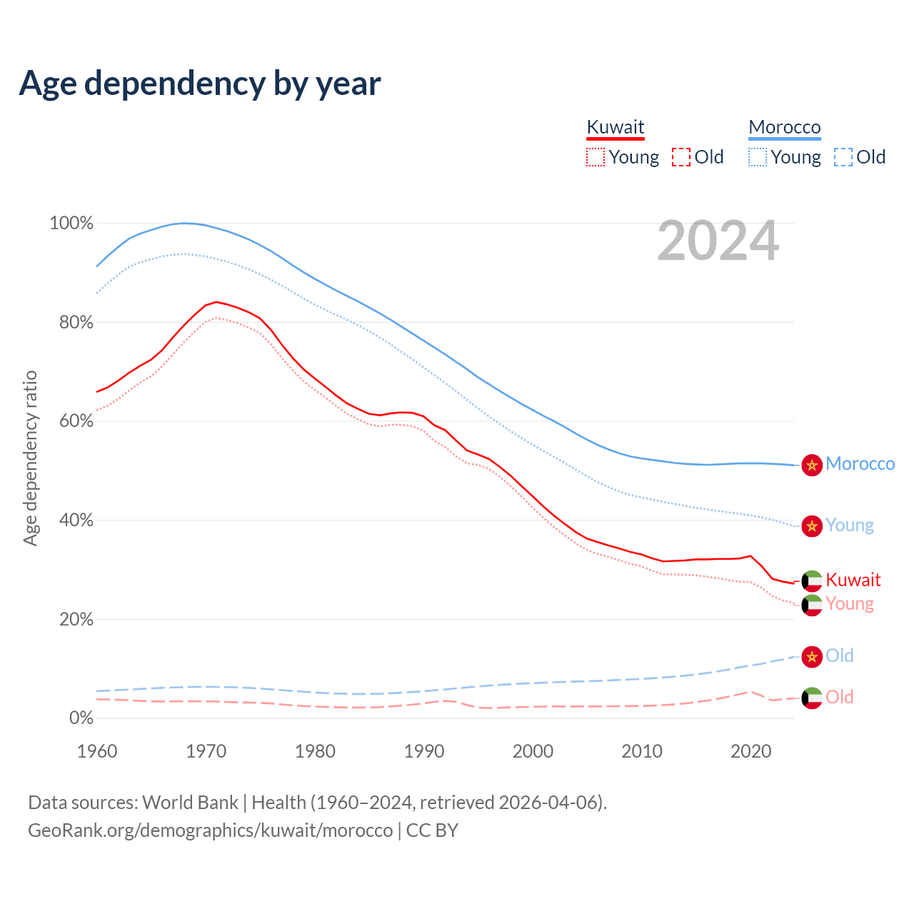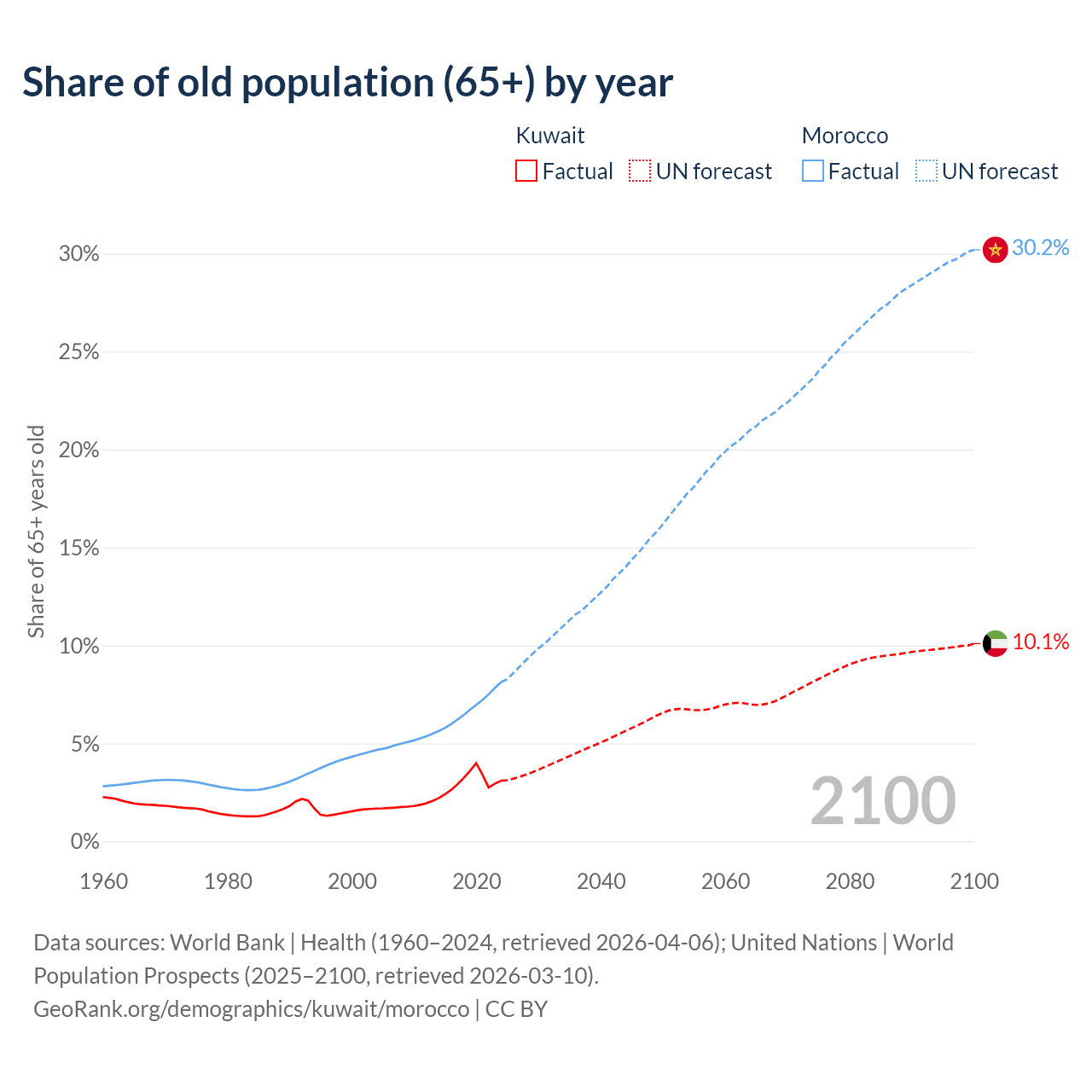 The share of older people aged 65 and over is 3.1% in Kuwait and 8.14% in Morocco. Life expectancy in Kuwait compared to Morocco .