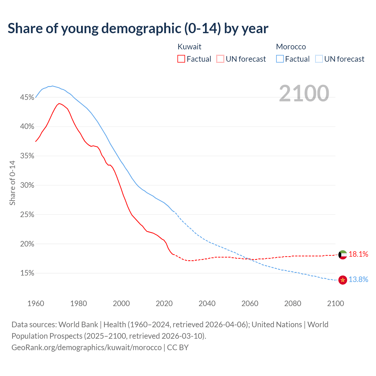 - The share of young demographic (0-15 years old) in Kuwait is 18.2% vs 25.6% in Morocco.