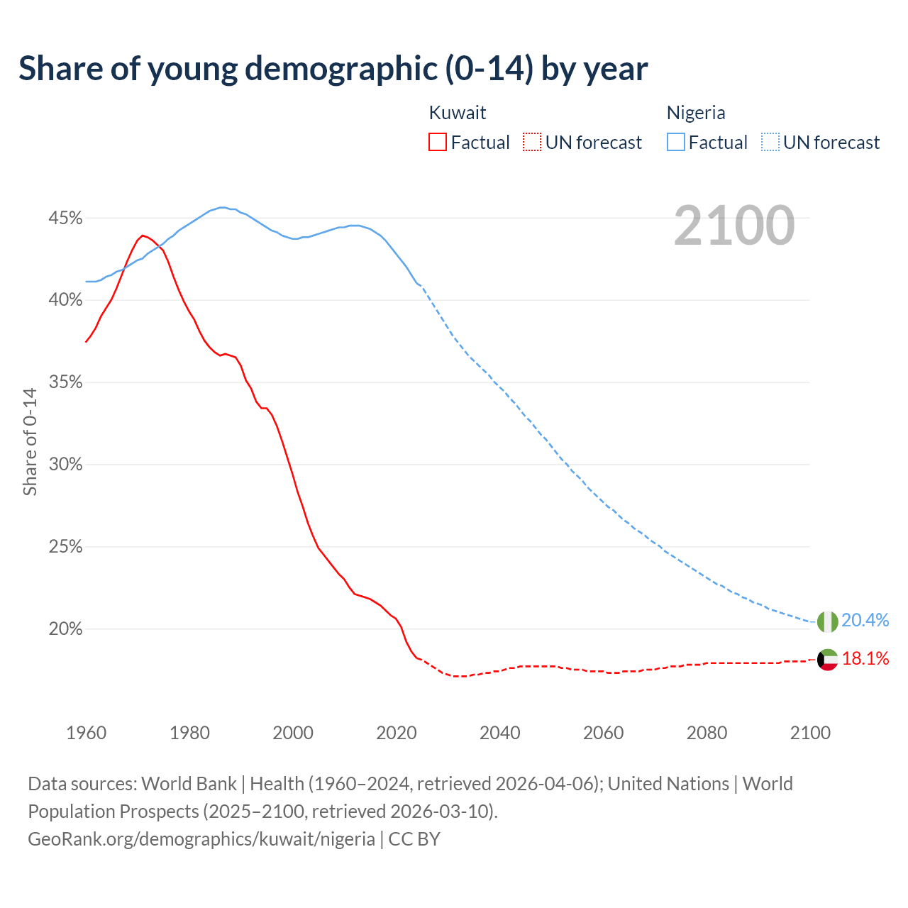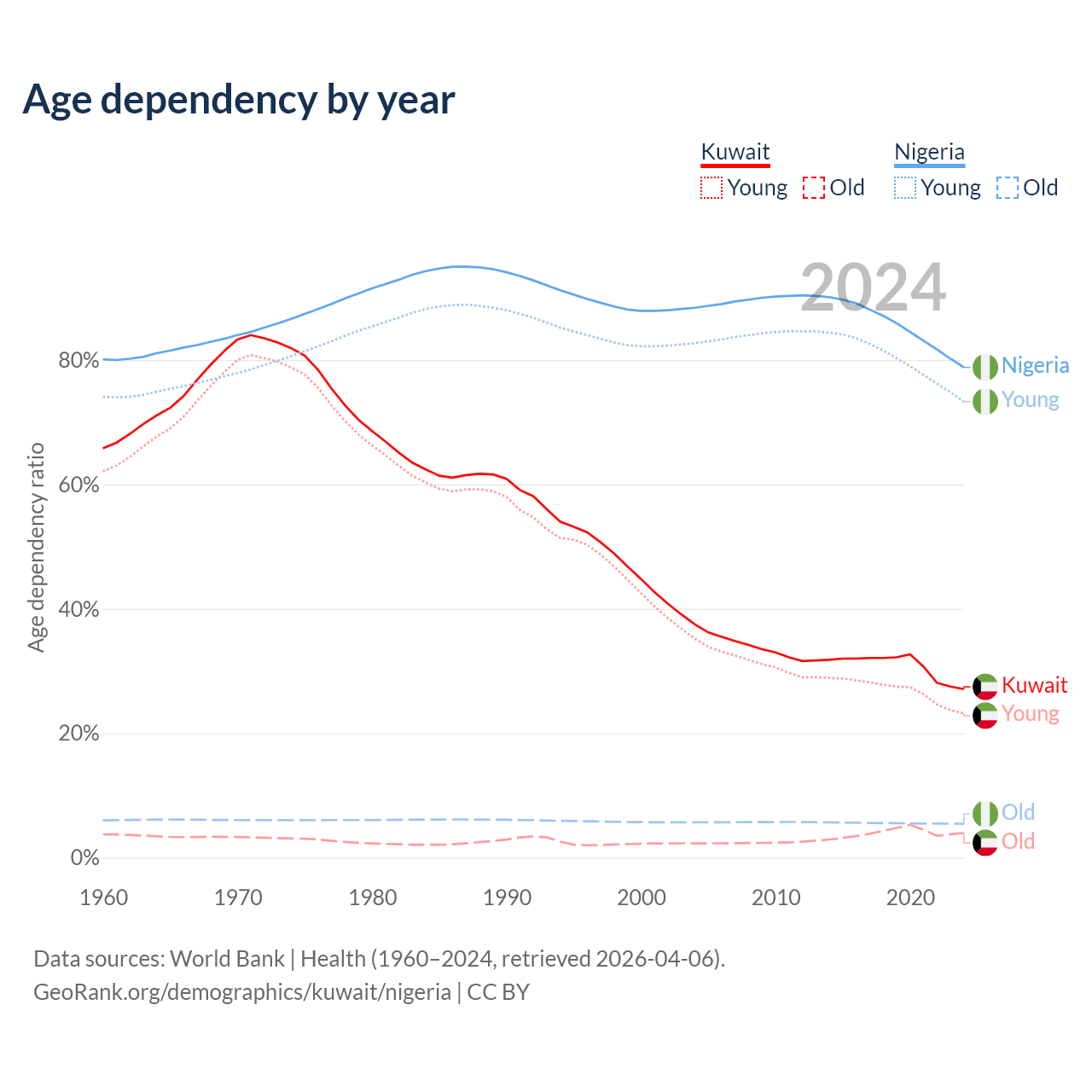 - Kuwait is ranked 71/196 by median age (oldest to youngest) vs 178/196 for Nigeria.