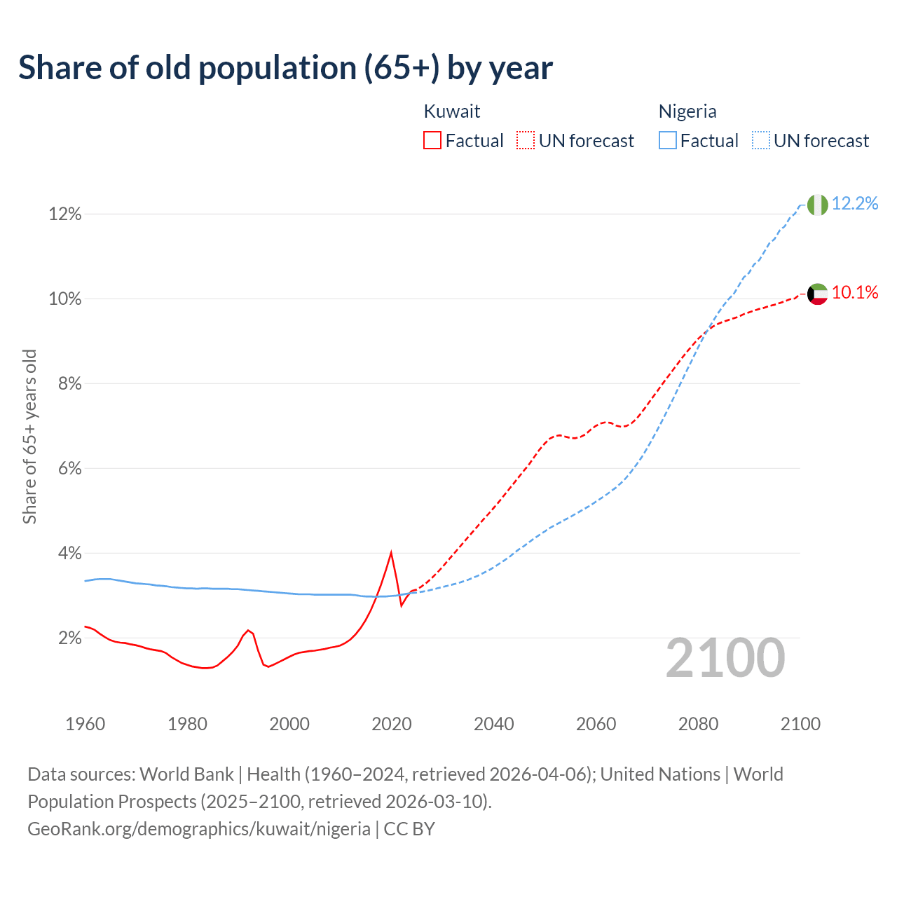 The share of older people aged 65 and over is 3.1% in Kuwait and 3.05% in Nigeria. Life expectancy in Kuwait compared to Nigeria .