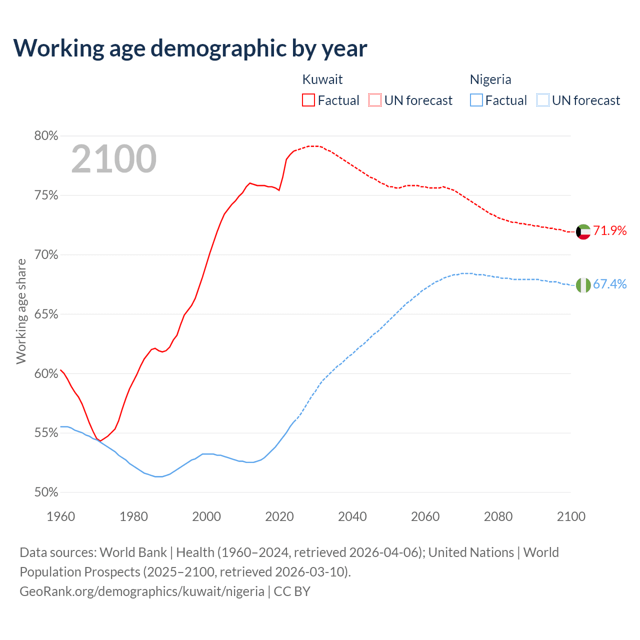 - Kuwait has 4.01M working age adults (aged 15-64) vs 136M in Nigeria.