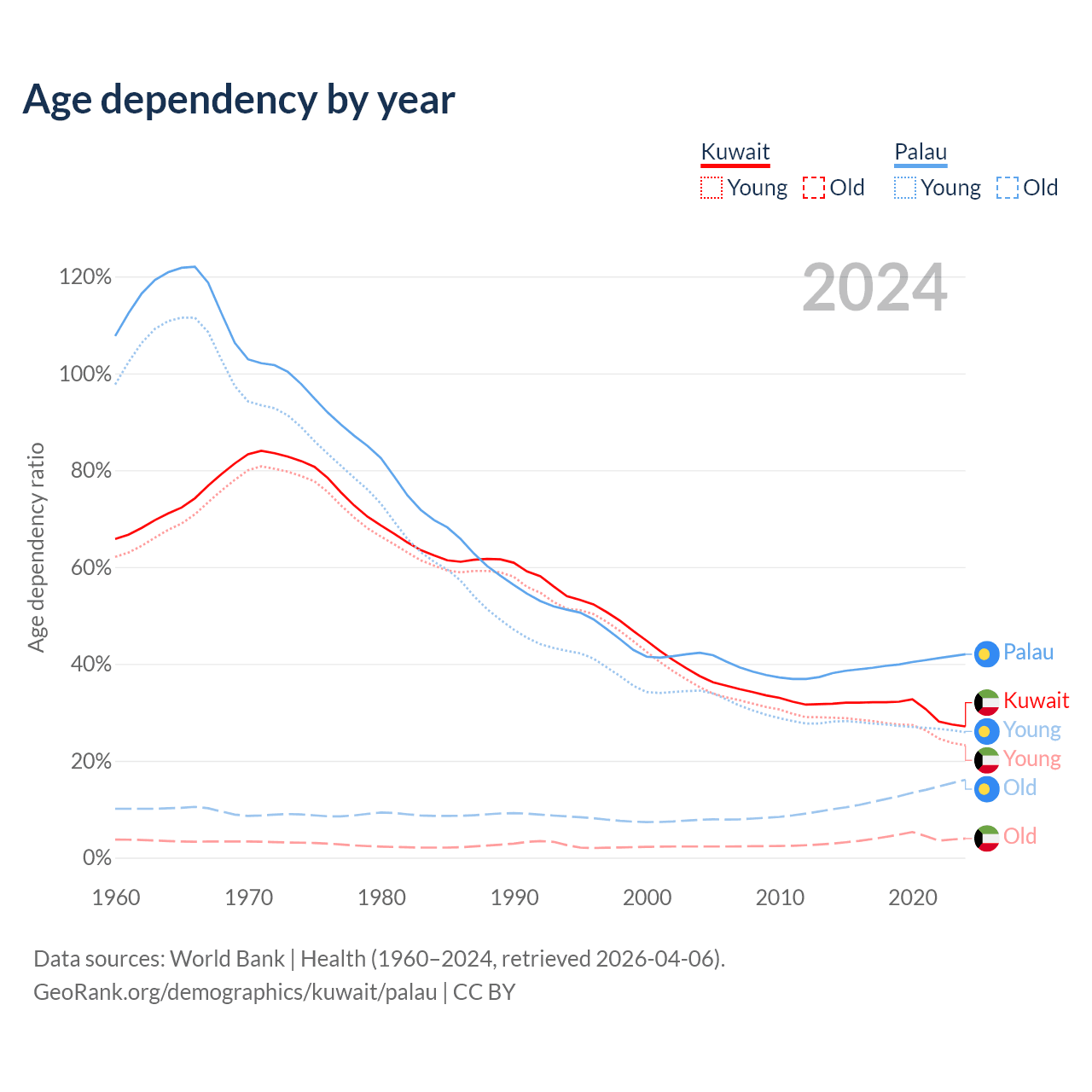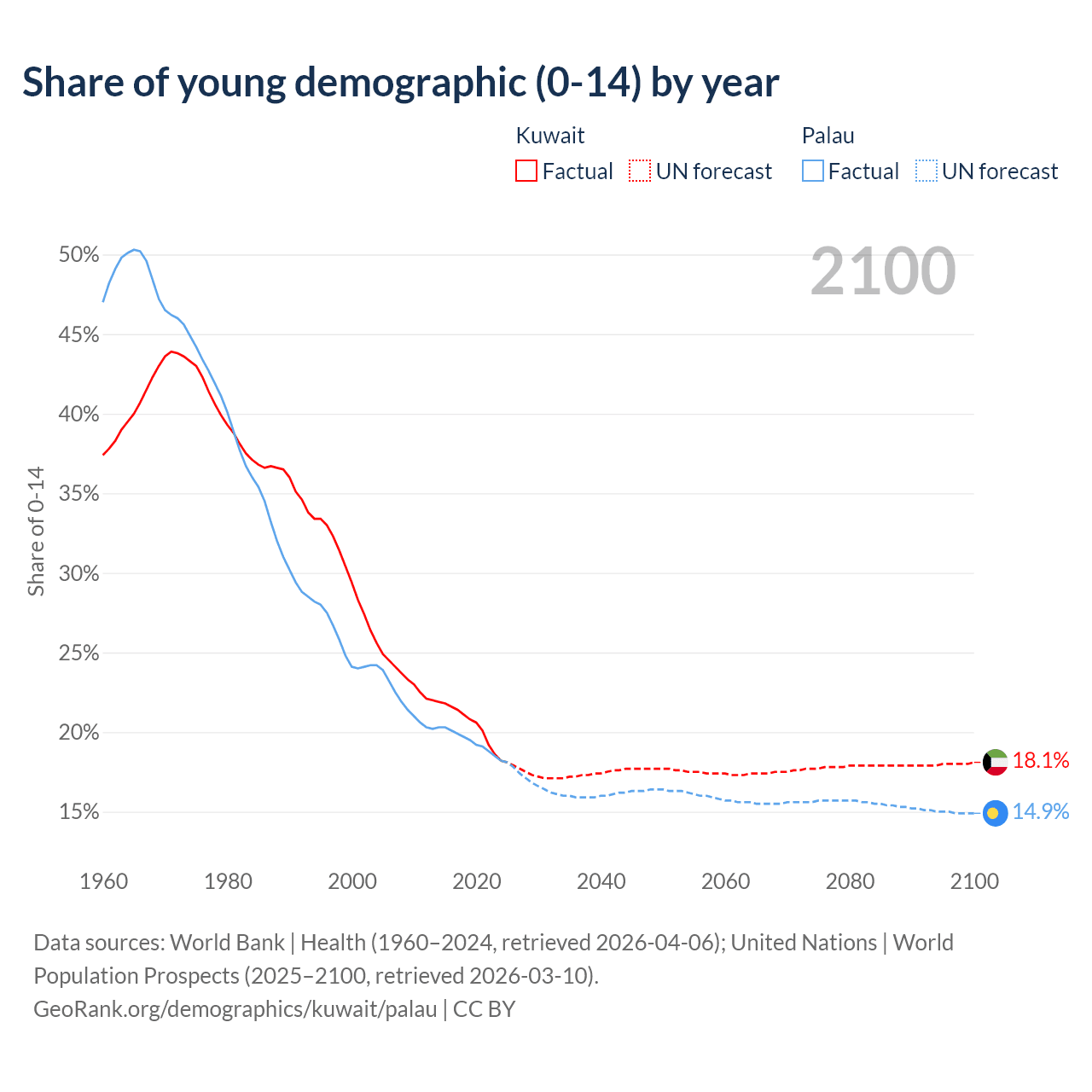 - The share of young demographic (0-15 years old) in Kuwait is 18.2% vs 18.2% in Palau.