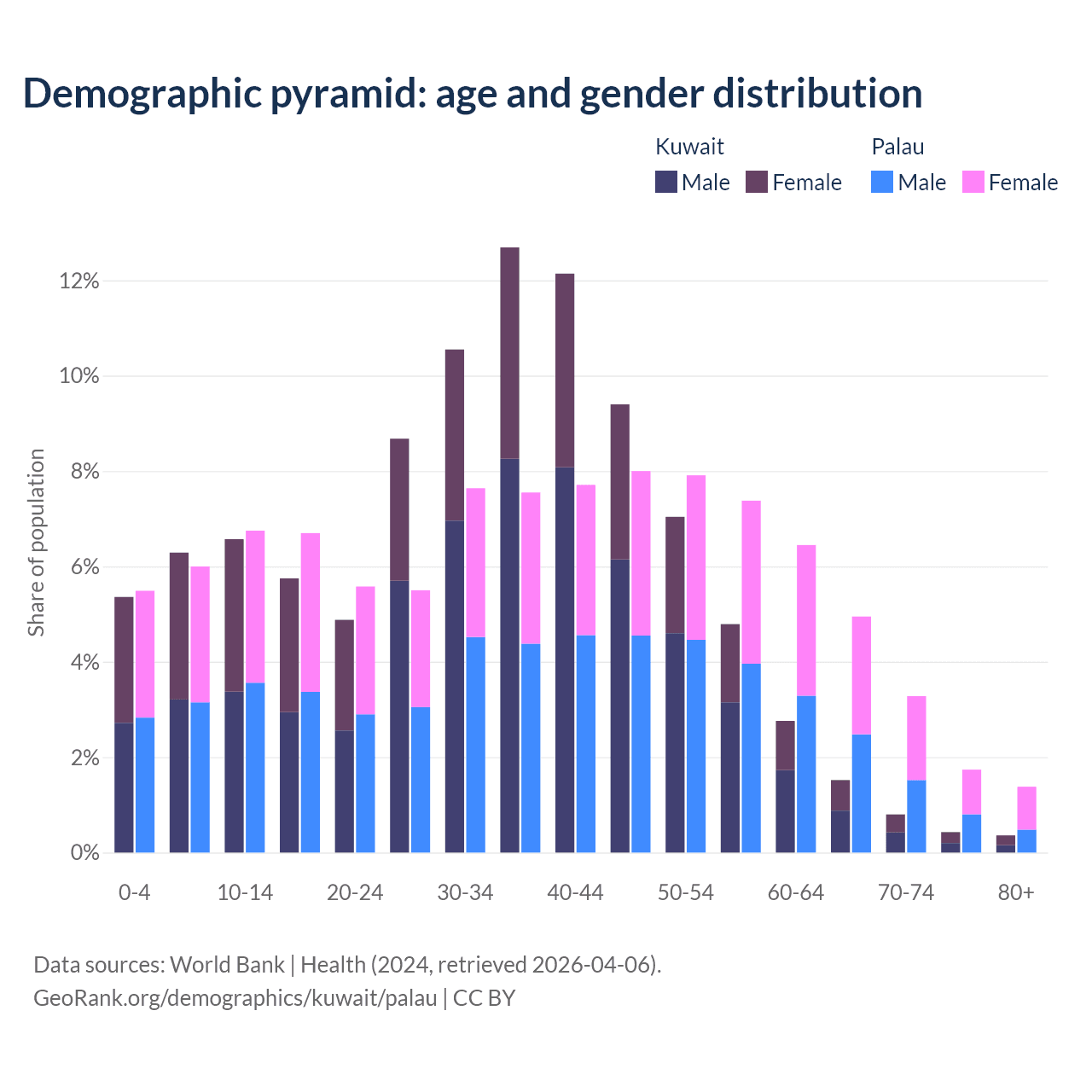 - Kuwait is ranked 71/196 by median age (oldest to youngest) vs 53/196 for Palau.