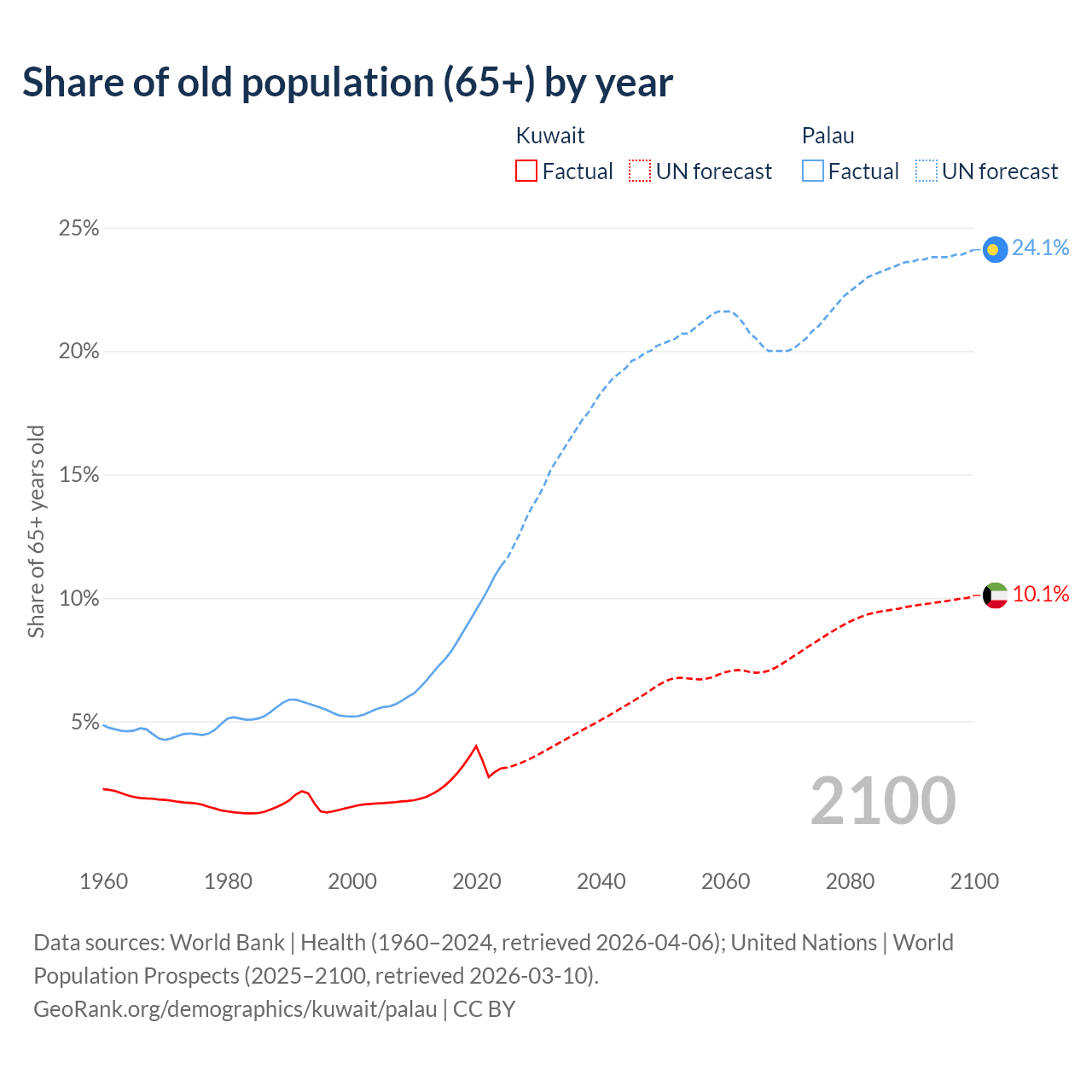 The share of older people aged 65 and over is 3.1% in Kuwait and 11.3% in Palau. Life expectancy in Kuwait compared to Palau .