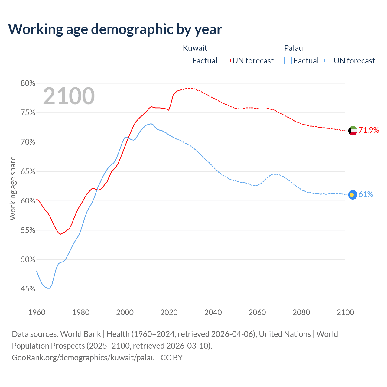 - Kuwait has 4.01M working age adults (aged 15-64) vs 12.4K in Palau.