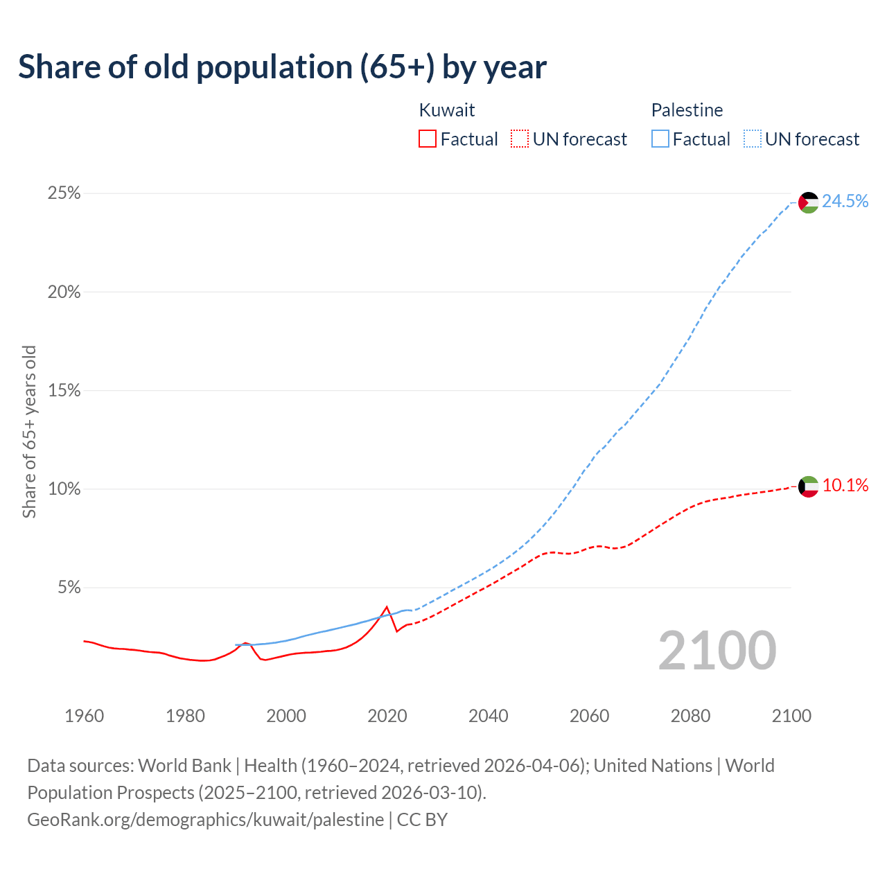 The share of older people aged 65 and over is 3.1% in Kuwait and 3.84% in Palestine. Life expectancy in Kuwait compared to Palestine .