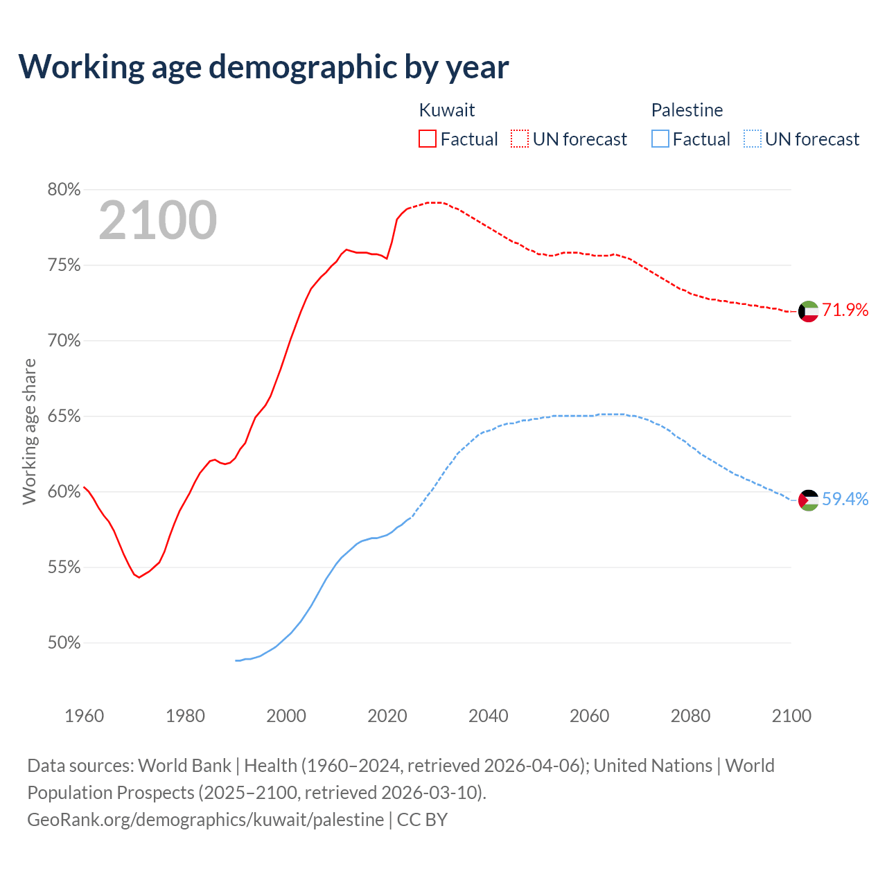 Median age Kuwait vs Palestine, 1960-2100