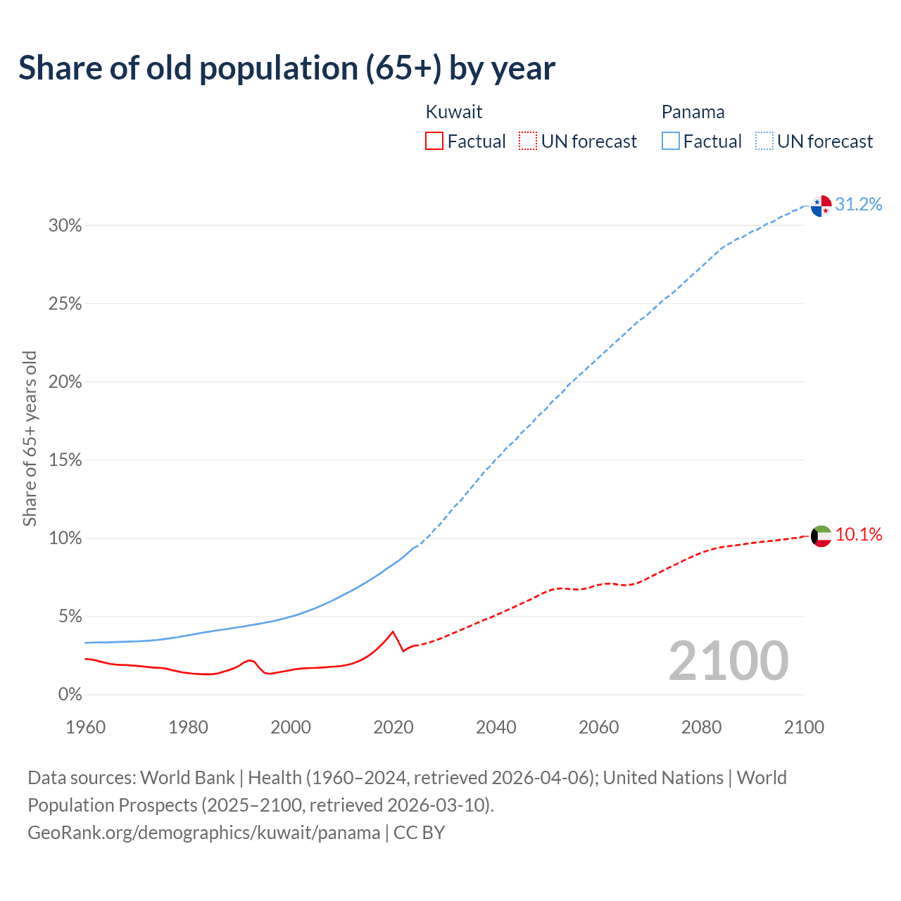 The share of older people aged 65 and over is 3.1% in Kuwait and 9.35% in Panama. Life expectancy in Kuwait compared to Panama .