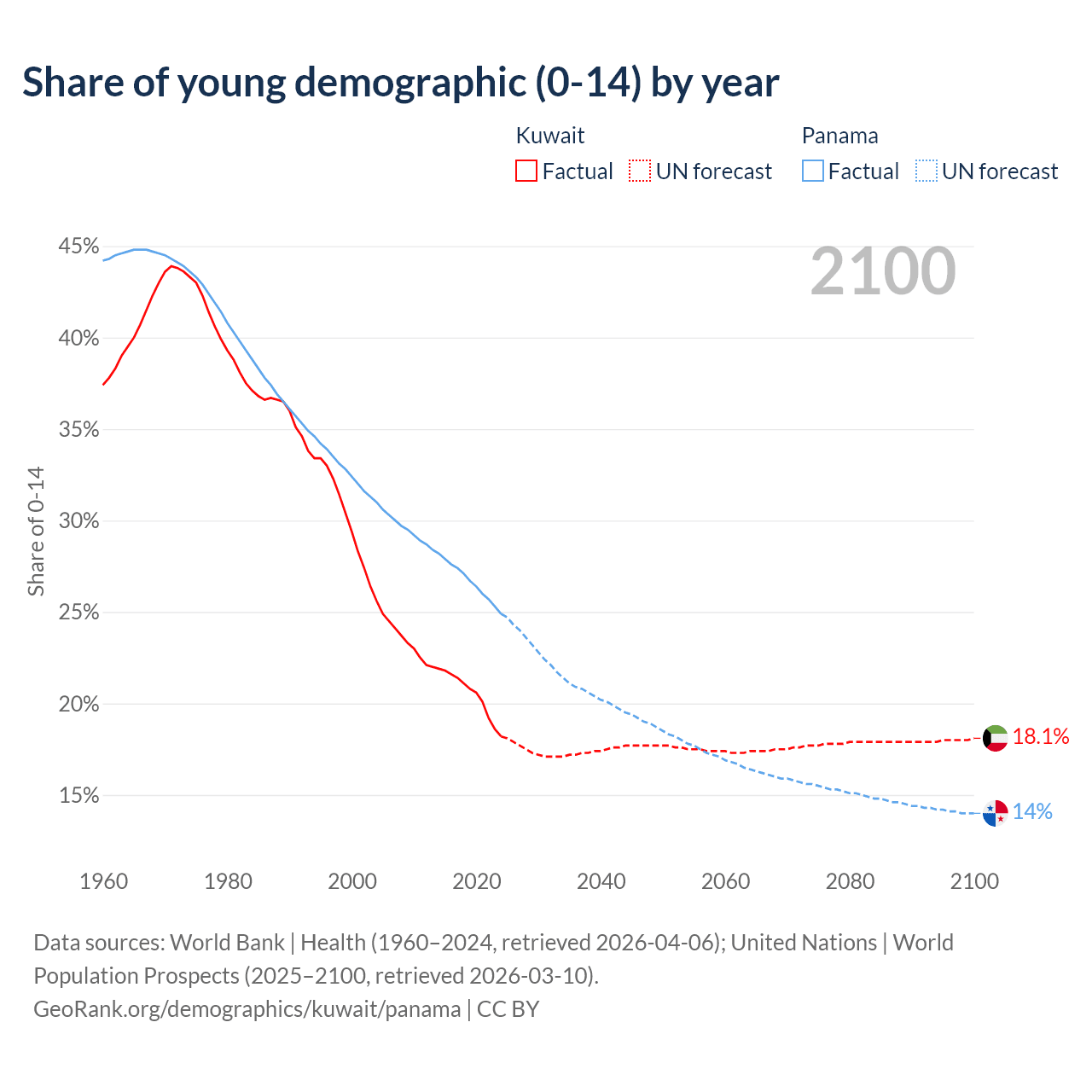 - The share of young demographic (0-15 years old) in Kuwait is 18.2% vs 24.9% in Panama.