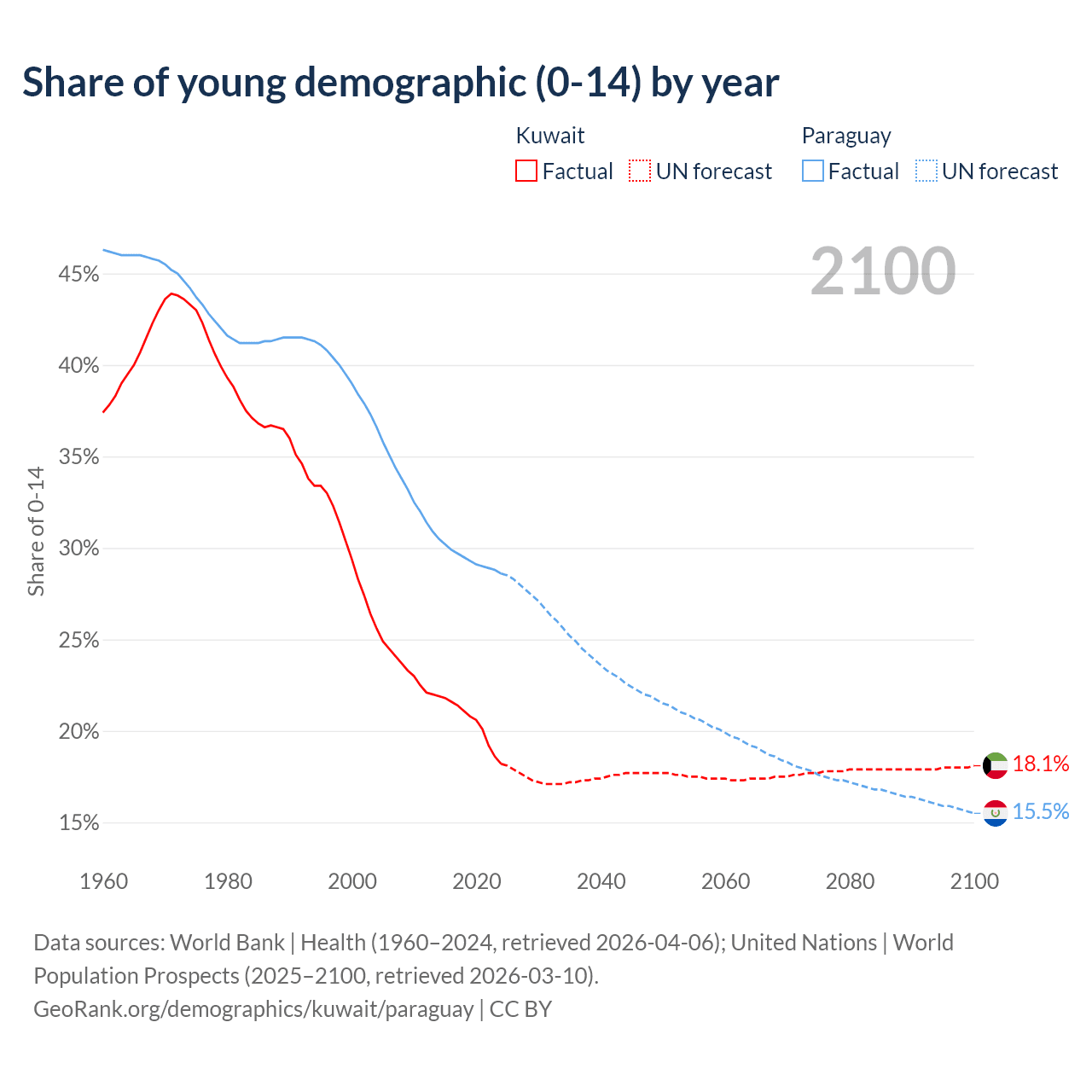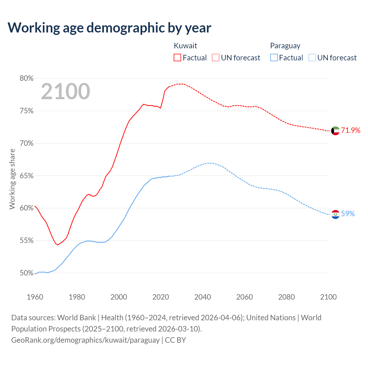 Median age Kuwait vs Paraguay, 1960-2100