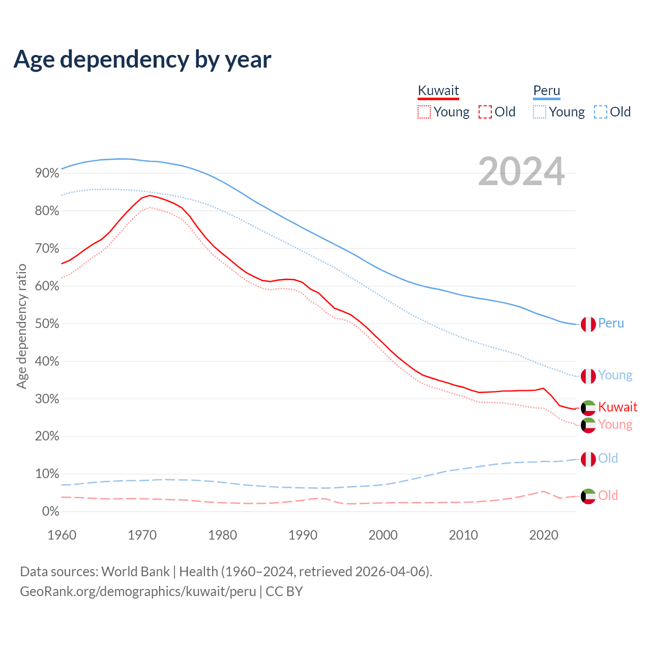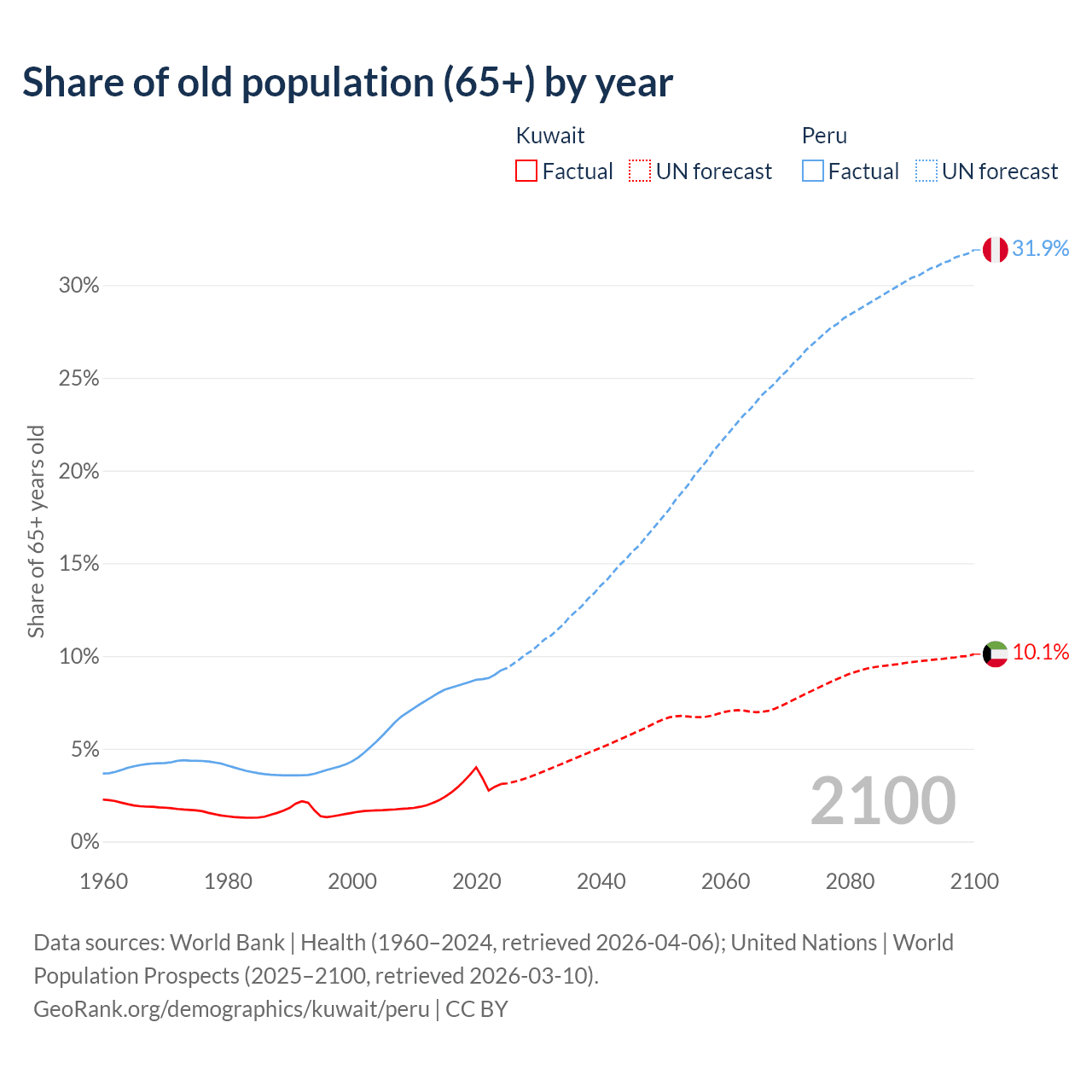 The share of older people aged 65 and over is 3.1% in Kuwait and 9.23% in Peru. Life expectancy in Kuwait compared to Peru .