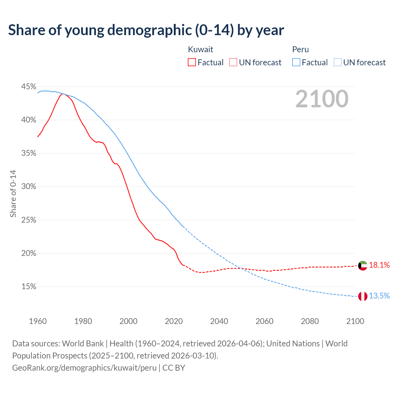 Median age Kuwait vs Peru, 1960-2100