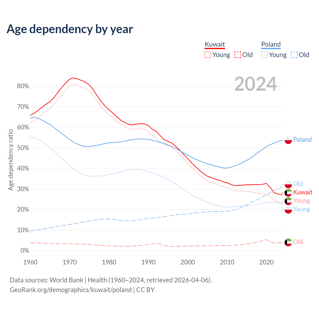 The share of older people aged 65 and over is 3.1% in Kuwait and 20.1% in Poland. Life expectancy in Kuwait compared to Poland .