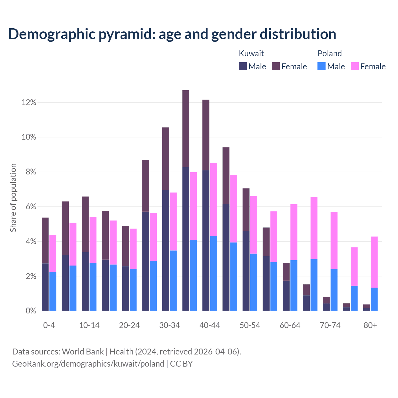 - Kuwait is ranked 71/196 by median age (oldest to youngest) vs 30/196 for Poland.