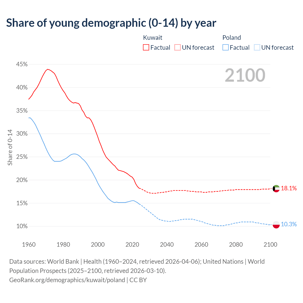 - The share of young demographic (0-15 years old) in Kuwait is 18.2% vs 14.8% in Poland.