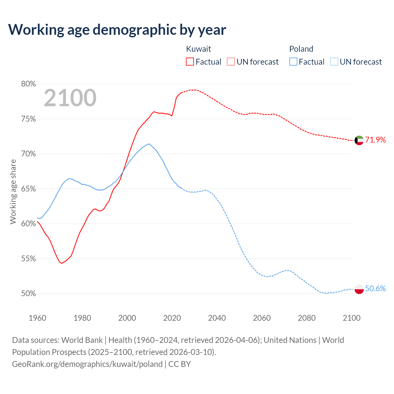 - Kuwait has 4.01M working age adults (aged 15-64) vs 23.3M in Poland.